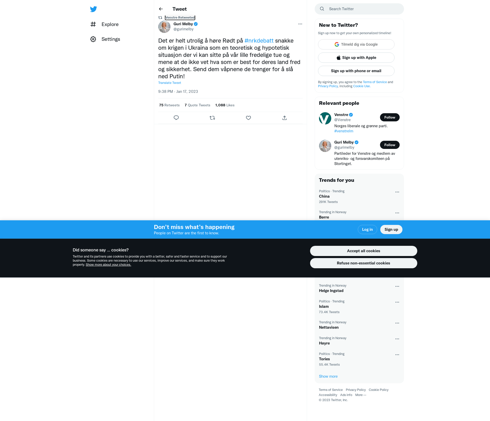 RT @gurimelby: Det er helt utrolig å høre Rødt på #nrkdebatt snakke om krigen i Ukraina som en teoretisk og hypotetisk situasjon der vi kan sitte på vår lille fredelige tue og mene at de ikke vet hva som er best for deres land fred og sikkerhet. Send dem våpnene de trenger for å slå ned Putin!