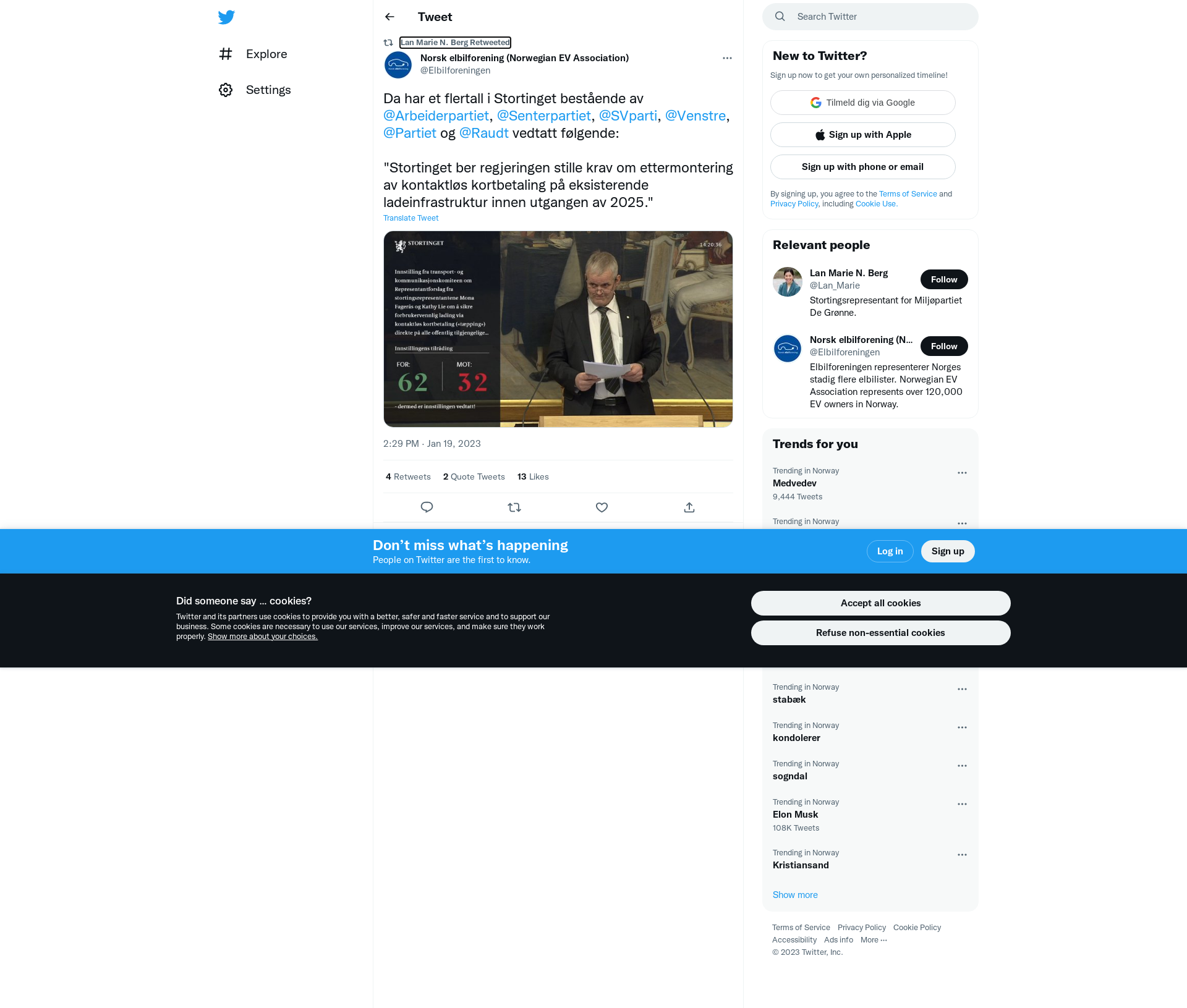RT @Elbilforeningen: Da har et flertall i Stortinget bestående av @Arbeiderpartiet, @Senterpartiet, @SVparti, @Venstre, @Partiet og @Raudt vedtatt følgende:\n\n"Stortinget ber regjeringen stille krav om ettermontering av kontaktløs kortbetaling på eksisterende ladeinfrastruktur innen utgangen av 2025." https://t.co/Et6zWfMuqw