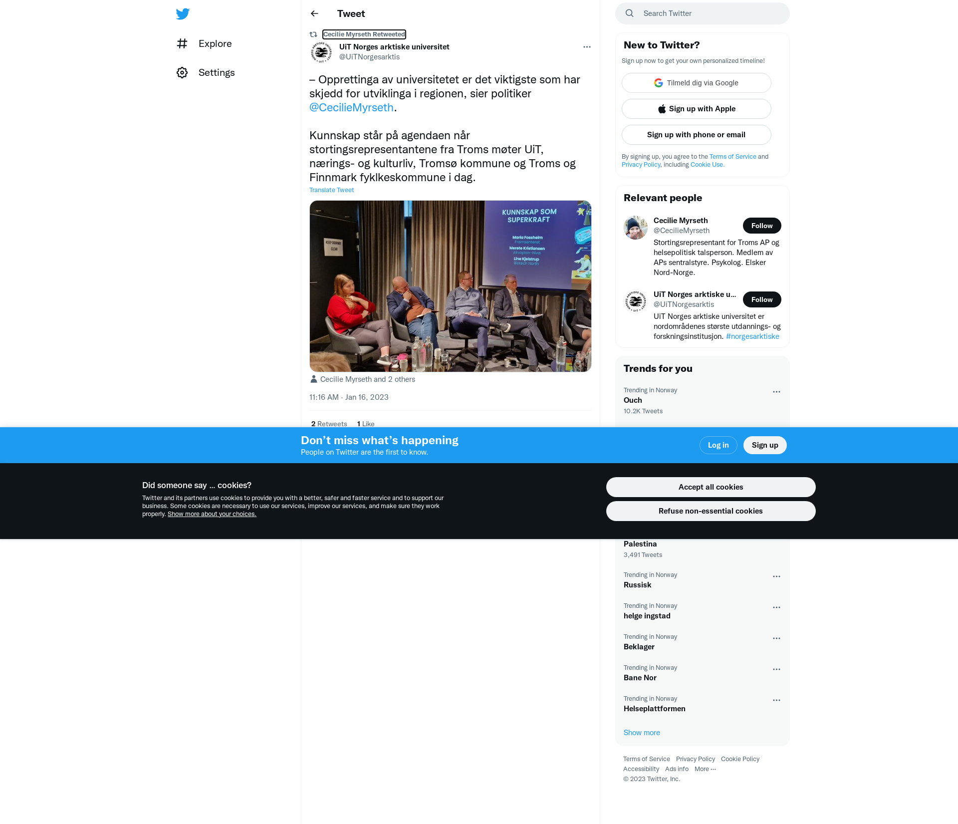 RT @UiTNorgesarktis: – Opprettinga av universitetet er det viktigste som har skjedd for utviklinga i regionen, sier politiker @CecilieMyrseth.\n\nKunnskap står på agendaen når stortingsrepresentantene fra Troms møter UiT, nærings- og kulturliv, Tromsø kommune og Troms og Finnmark fyklkeskommune i dag. https://t.co/V1ACJkpG54