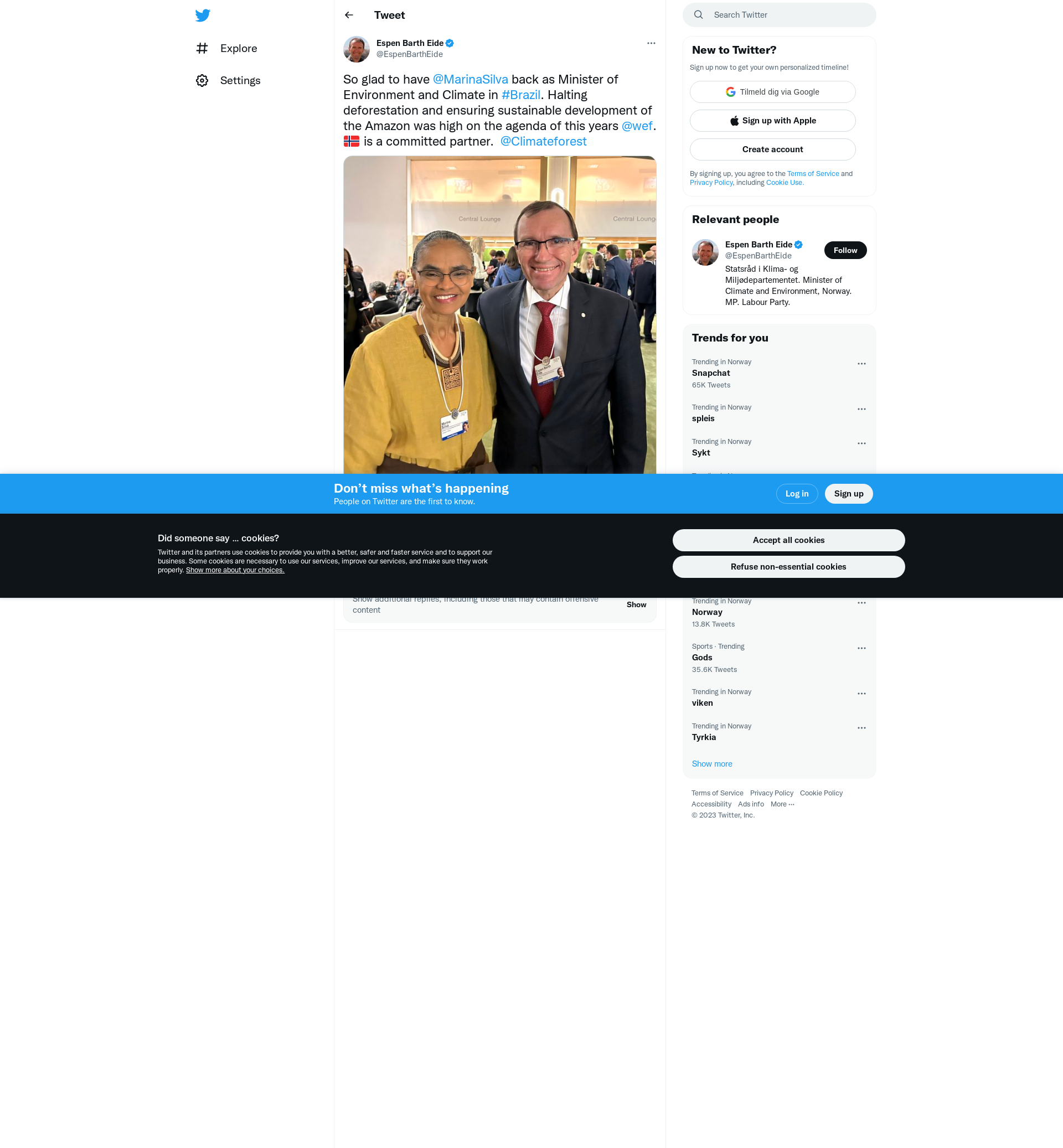 So glad to have @MarinaSilva back as Minister of Environment and Climate in #Brazil. Halting deforestation and ensuring sustainable development of the Amazon was high on the agenda of this years @wef. 🇳🇴 is a committed partner. @Climateforest https://t.co/dRoj7yOQPA