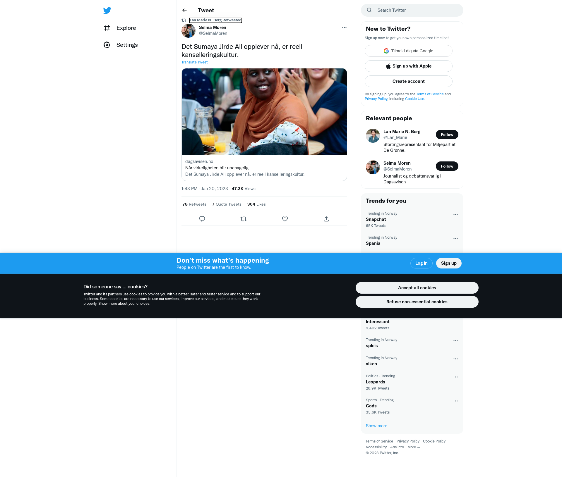 RT @SelmaMoren: Det Sumaya Jirde Ali opplever nå, er reell kanselleringskultur.\n\nhttps://t.co/cBL5CTVFdH