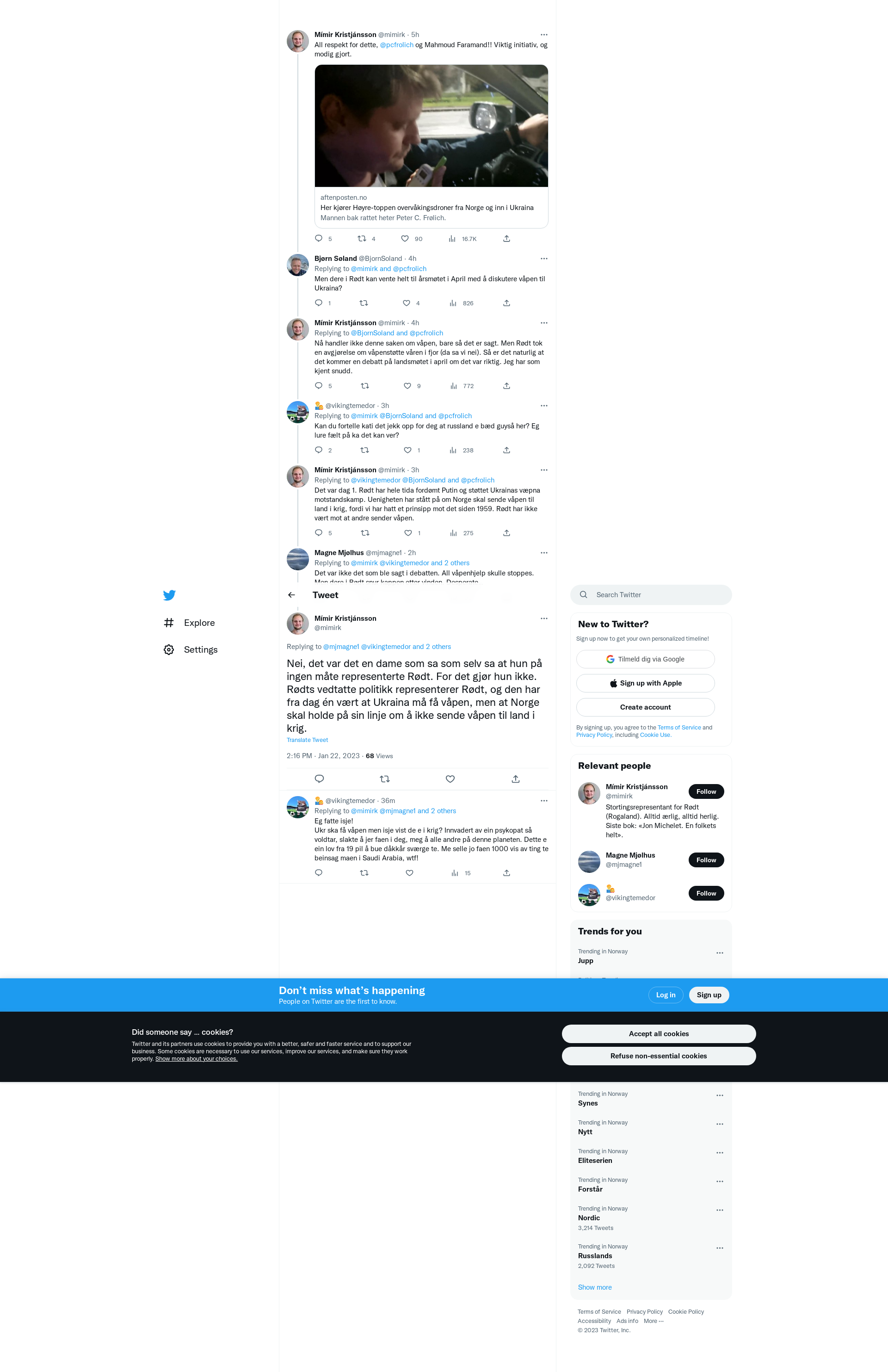 @mjmagne1 @vikingtemedor @BjornSoland @pcfrolich Nei, det var det en dame som sa som selv sa at hun på ingen måte representerte Rødt. For det gjør hun ikke. Rødts vedtatte politikk representerer Rødt, og den har fra dag én vært at Ukraina må få våpen, men at Norge skal holde på sin linje om å ikke sende våpen til land i krig.