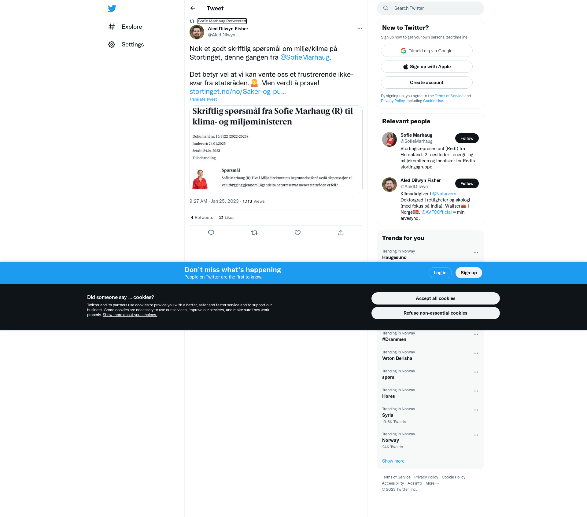 RT @AledDilwyn: Nok et godt skriftlig spørsmål om miljø/klima på Stortinget, denne gangen fra @SofieMarhaug.\n\nDet betyr vel at vi kan vente…