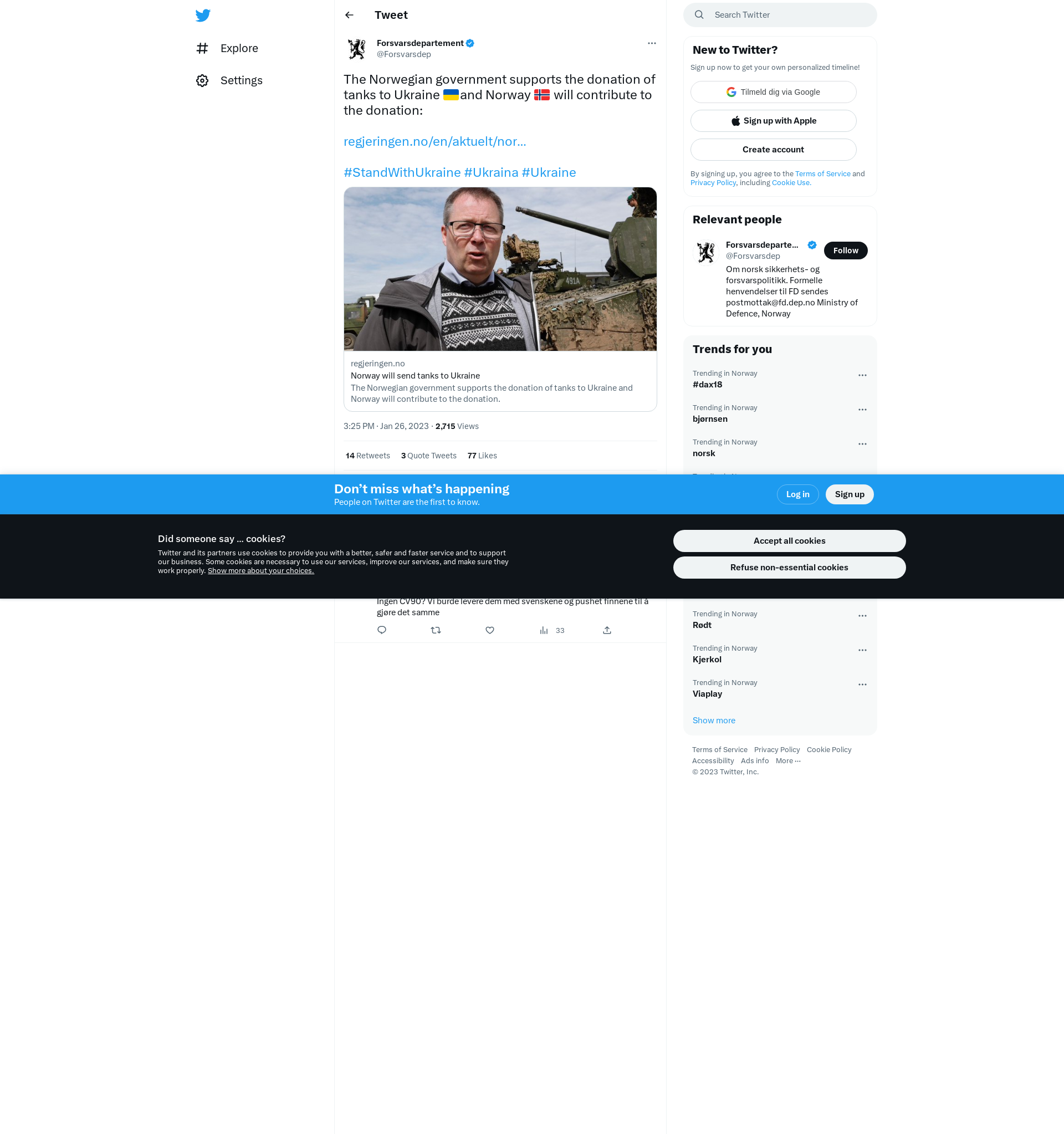 The Norwegian government supports the donation of tanks to Ukraine 🇺🇦and Norway 🇳🇴 will contribute to the donation:\n\nhttps://t.co/zWJIktojqv\n\n#StandWithUkraine #Ukraina #Ukraine️