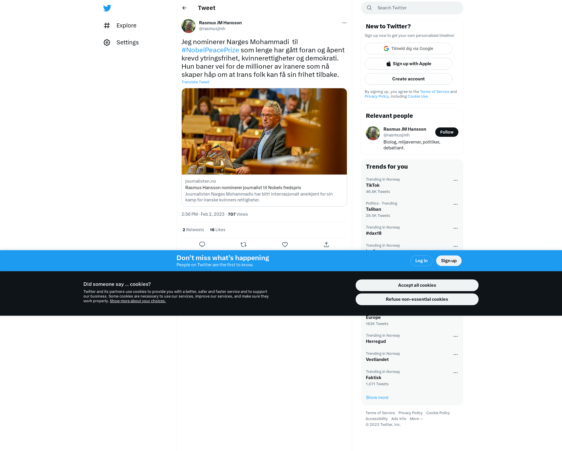 Jeg nominerer Narges Mohammadi til #NobelPeacePrize som lenge har gått foran og åpent krevd ytringsfrihet, kvinnerettigheter og demokrati. Hun baner vei for de millioner av iranere som nå skaper håp om at Irans folk kan få sin frihet tilbake.\n\nhttps://t.co/KsgbeqHV2k