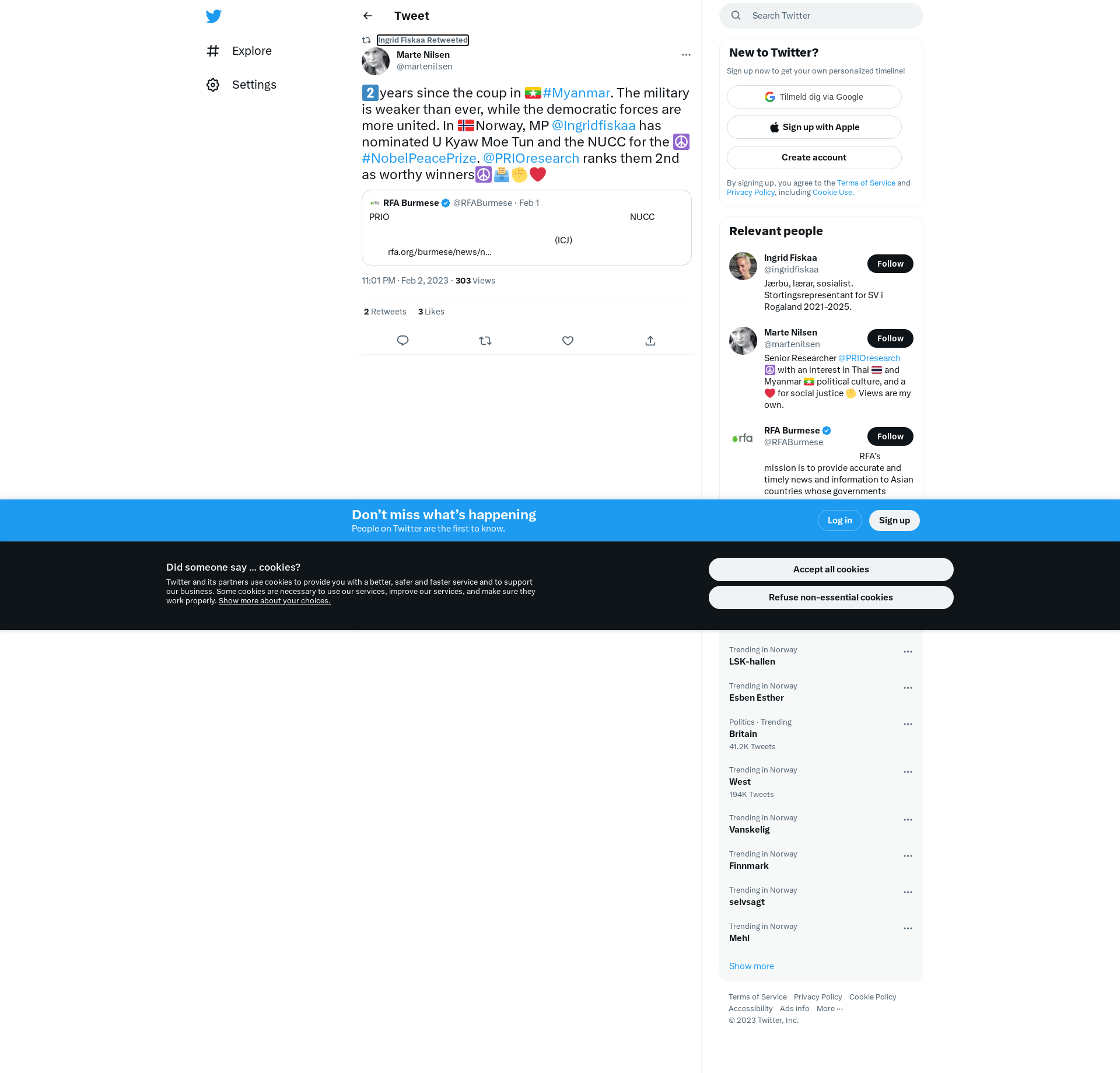 RT @martenilsen: 2⃣years since the coup in 🇲🇲#Myanmar. The military is weaker than ever, while the democratic forces are more united. In 🇳🇴Norway, MP @Ingridfiskaa has nominated U Kyaw Moe Tun and the NUCC for the ☮️#NobelPeacePrize. @PRIOresearch ranks them 2nd as worthy winners☮️🗳️✊❤️