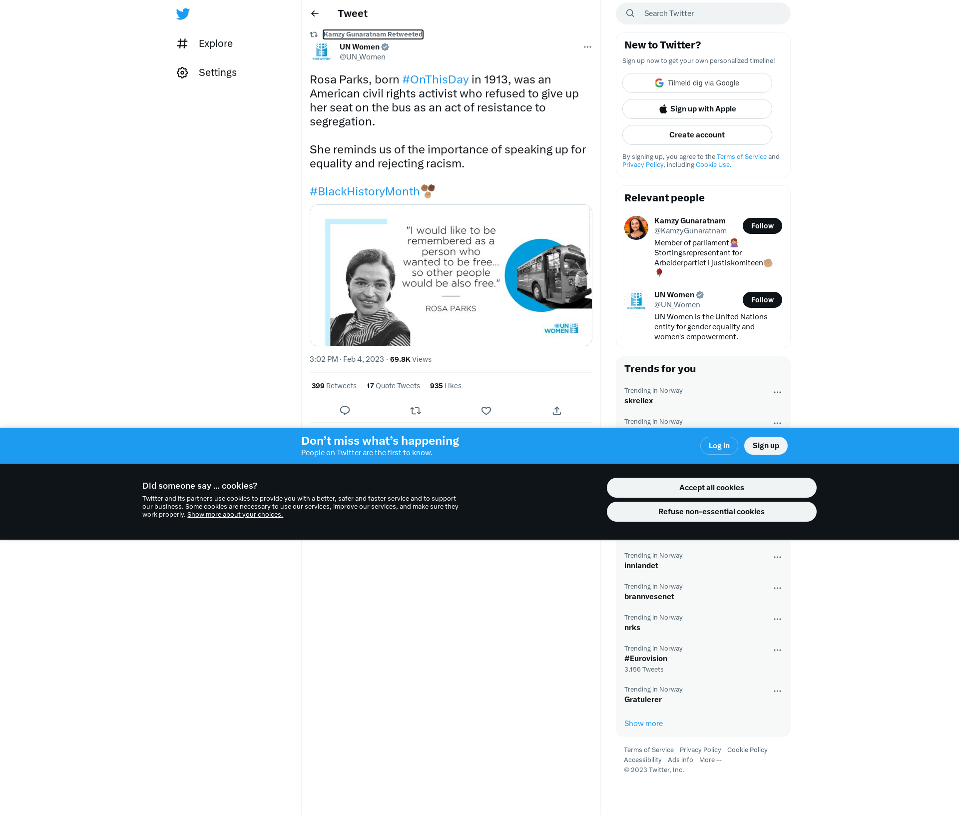 RT @UN_Women: Rosa Parks, born #OnThisDay in 1913, was an American civil rights activist who refused to give up her seat on the bus as an act of resistance to segregation.\n\nShe reminds us of the importance of speaking up for equality and rejecting racism. \n\n#BlackHistoryMonth https://t.co/UgpRpeaJCp