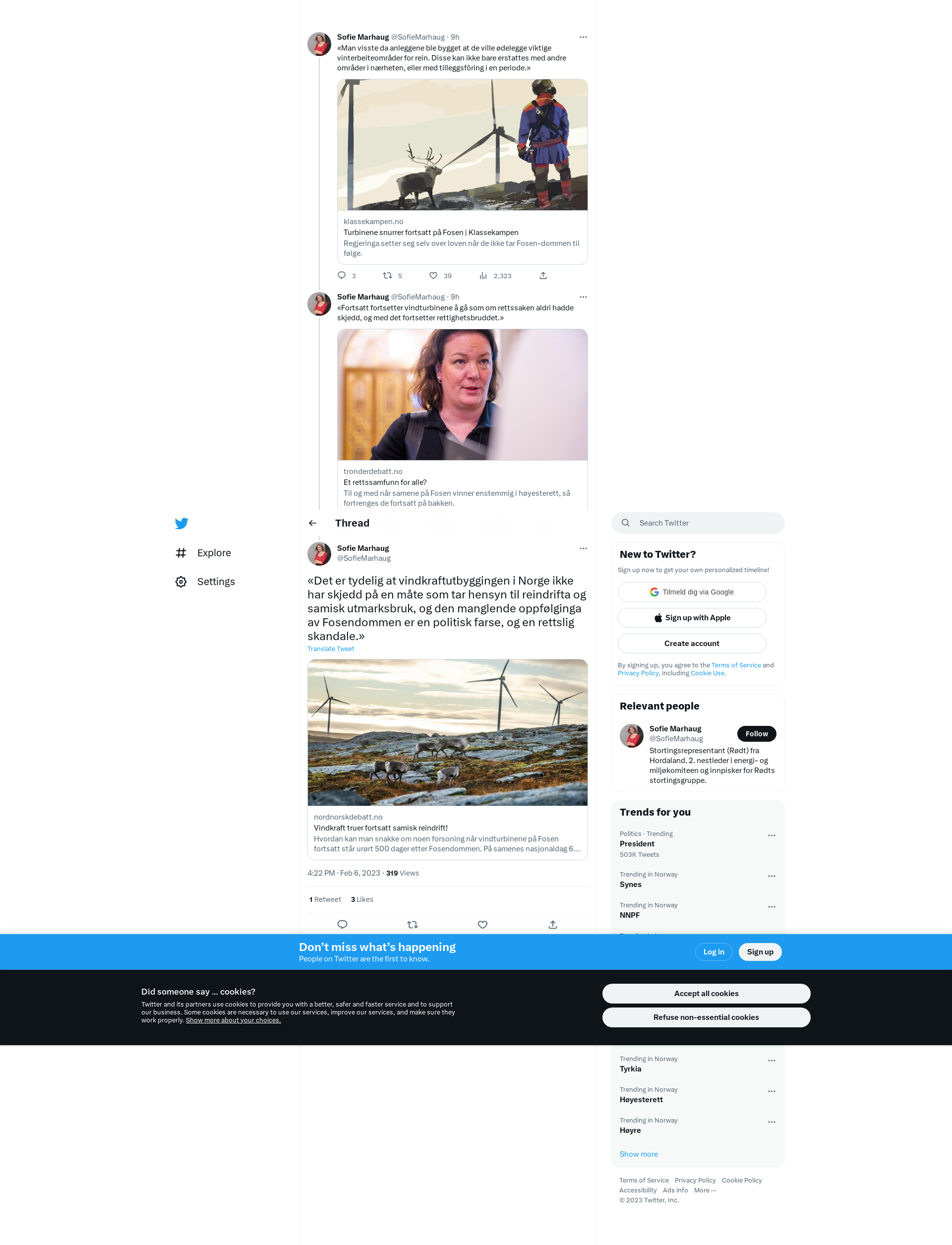 «Det er tydelig at vindkraftutbyggingen i Norge ikke har skjedd på en måte som tar hensyn til reindrifta og samisk utmarksbruk, og den manglende oppfølginga av Fosendommen er en politisk farse, og en rettslig skandale.»\n\nhttps://t.co/kThHCnCXIq