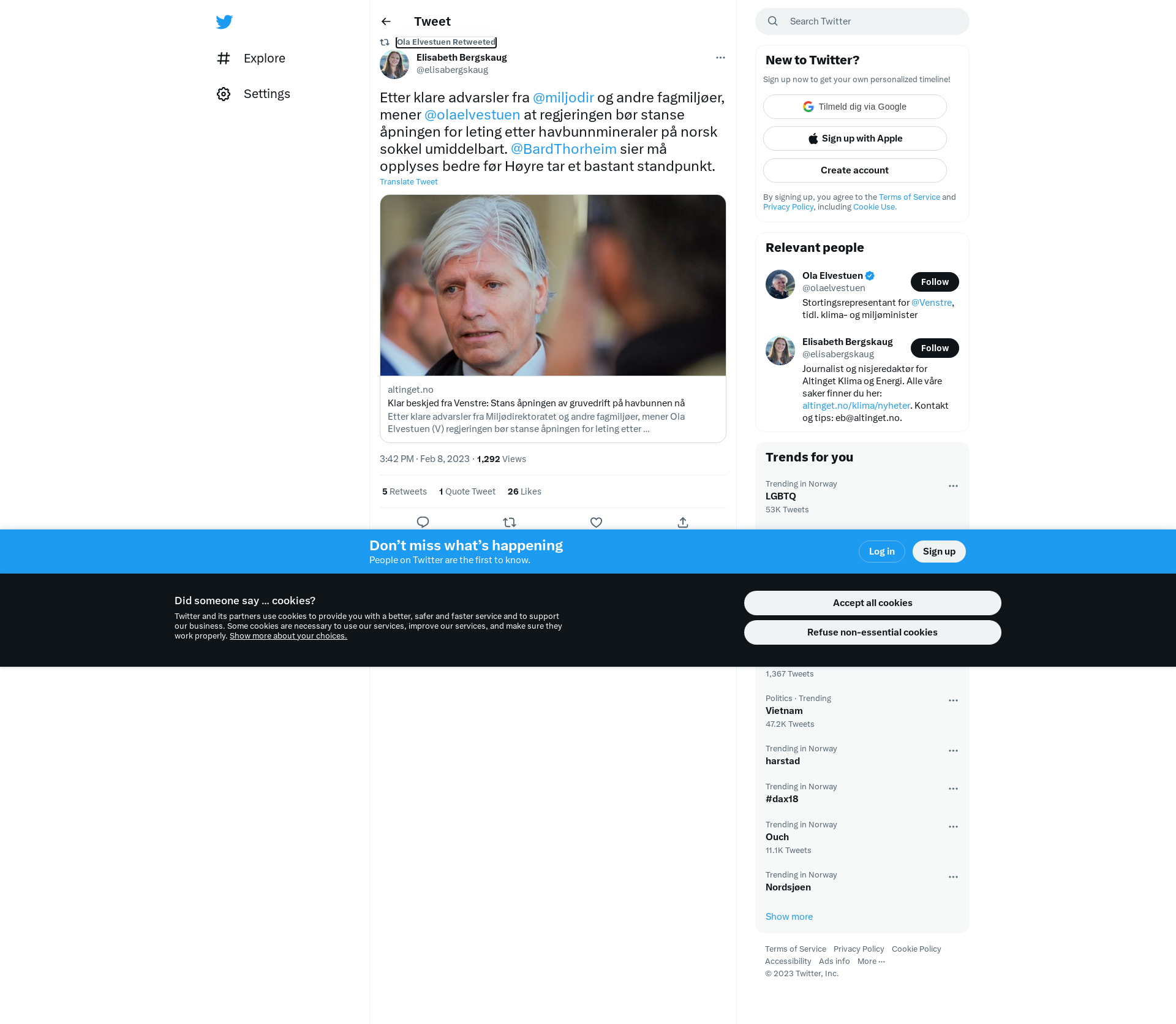 RT @elisabergskaug: Etter klare advarsler fra @miljodir og andre fagmiljøer, mener @olaelvestuen at regjeringen bør stanse åpningen for leting etter havbunnmineraler på norsk sokkel umiddelbart. @BardThorheim sier må opplyses bedre før Høyre tar et bastant standpunkt. https://t.co/nszjxZSF1L
