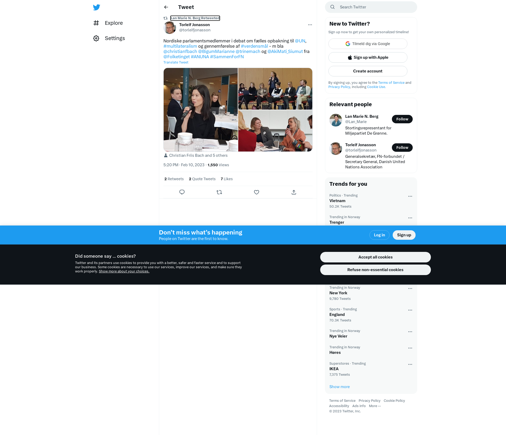 RT @torleifjonasson: Nordiske parlamentsmedlemmer i debat om fælles opbakning til @UN, #multilateralism og gennemførelse af #verdensmål - m bla @christianfbach @BigumMarianne @trinemach og @AkiMati_Siumut fra @Folketinget #ANUNA #SammenForFN https://t.co/QH5YrKr9hq