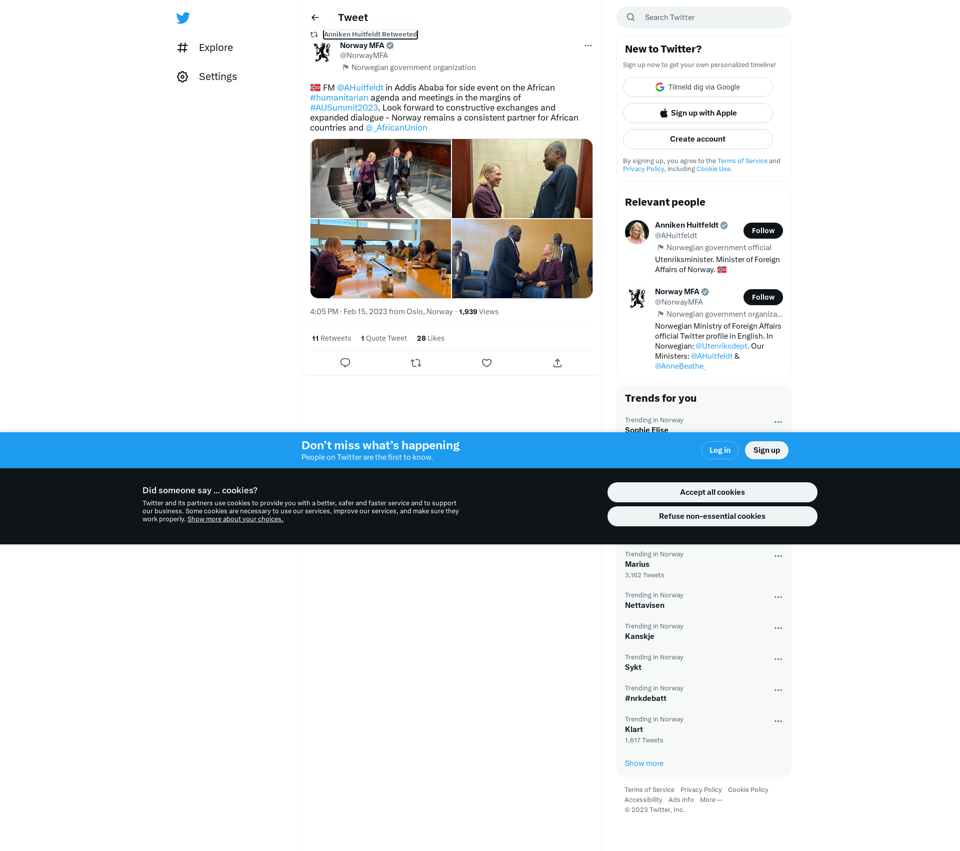 RT @NorwayMFA: 🇳🇴 FM @AHuitfeldt in Addis Ababa for side event on the African #humanitarian agenda and meetings in the margins of #AUSummit2023. Look forward to constructive exchanges and expanded dialogue - Norway remains a consistent partner for African countries and @_AfricanUnion https://t.co/GaQxVW7Nfq