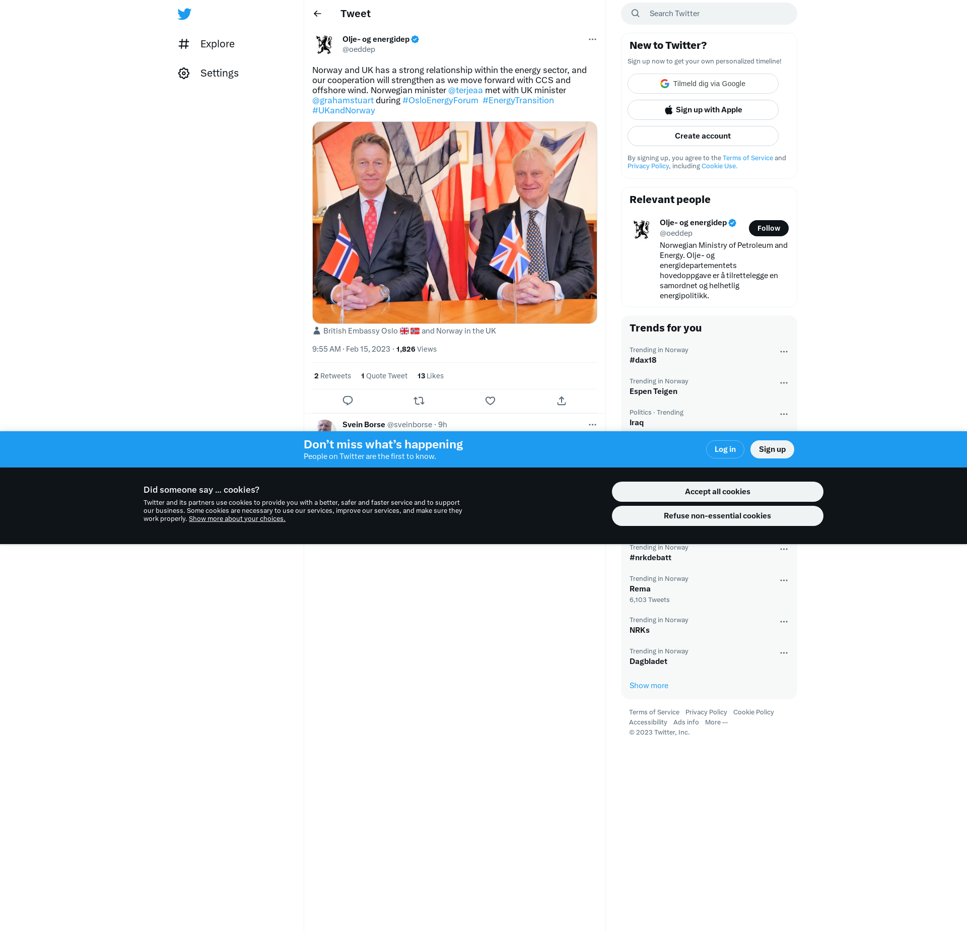 Norway and UK has a strong relationship within the energy sector, and our cooperation will strengthen as we move forward with CCS and offshore wind. Norwegian minister @terjeaa met with UK minister @grahamstuart during #OsloEnergyForum #EnergyTransition #UKandNorway https://t.co/u2idWs8EGs