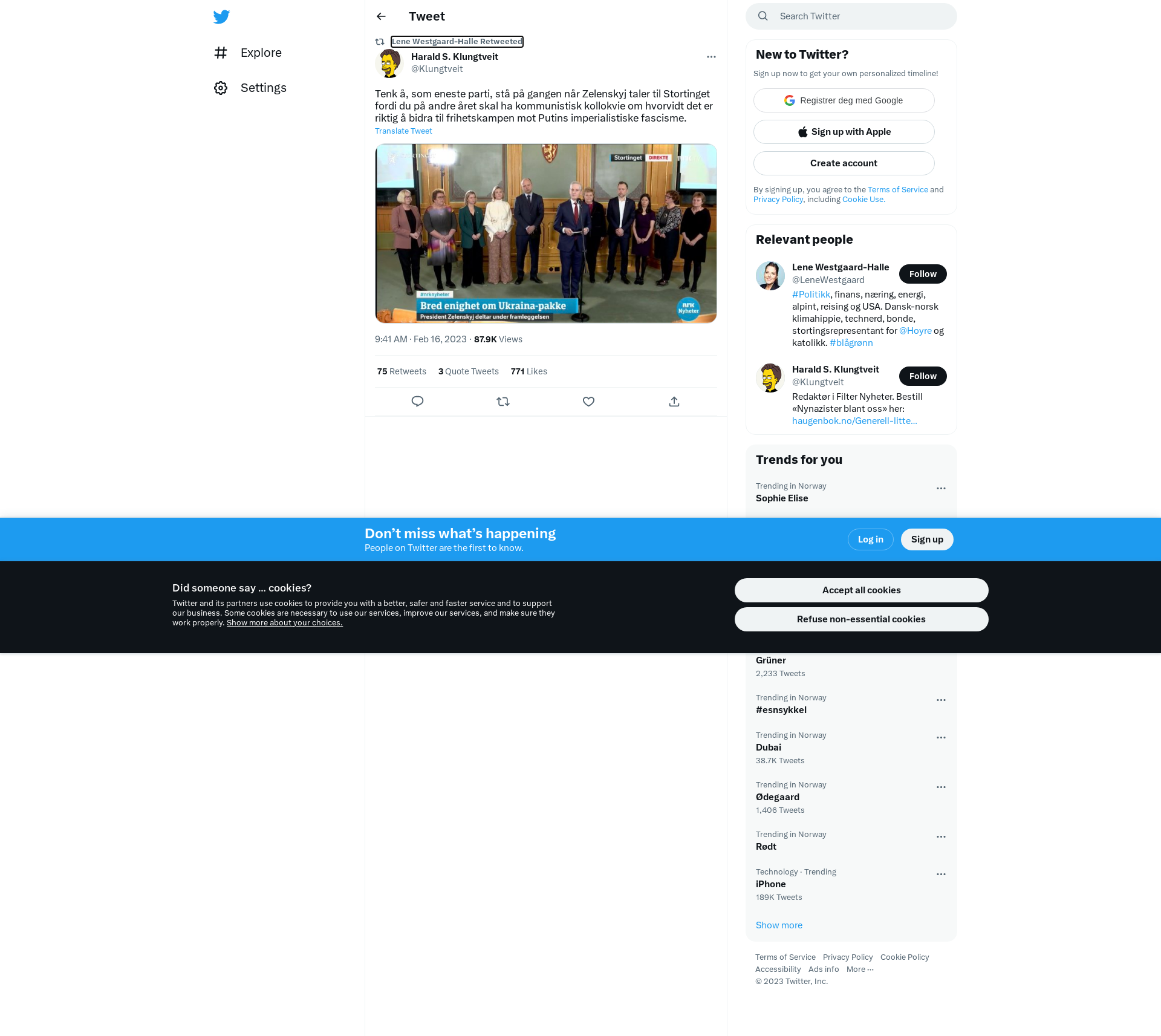 RT @Klungtveit: Tenk å, som eneste parti, stå på gangen når Zelenskyj taler til Stortinget fordi du på andre året skal ha kommunistisk kollokvie om hvorvidt det er riktig å bidra til frihetskampen mot Putins imperialistiske fascisme. https://t.co/aQQSzfSjjt