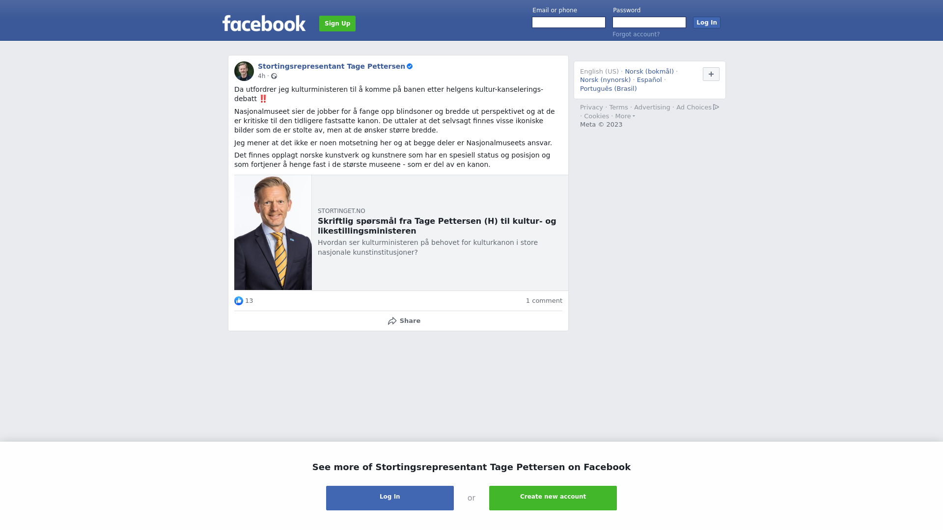 Da utfordrer jeg kulturministeren til å komme på banen etter helgens kultur-kanselerings-debatt ‼️\n\nNasjonalmuseet sier de jobber for å fange opp blindsoner og bredde ut perspektivet og at de er kritiske til den tidligere fastsatte kanon. De uttaler at det selvsagt finnes visse ikoniske bilder som de er stolte av, men at de ønsker større bredde.\n\nJeg mener at det ikke er noen motsetning her og at begge deler er Nasjonalmuseets ansvar.\n\nDet finnes opplagt norske kunstverk og kunstnere som har en spesiell status og posisjon og som fortjener å henge fast i de største museene - som er del av en kanon.