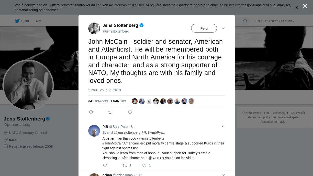 RT @jensstoltenberg: John McCain - soldier and senator, American and Atlanticist. He will be remembered both in Europe and North America for his courage and character, and as a strong supporter of NATO. My thoughts are with his family and loved ones.
