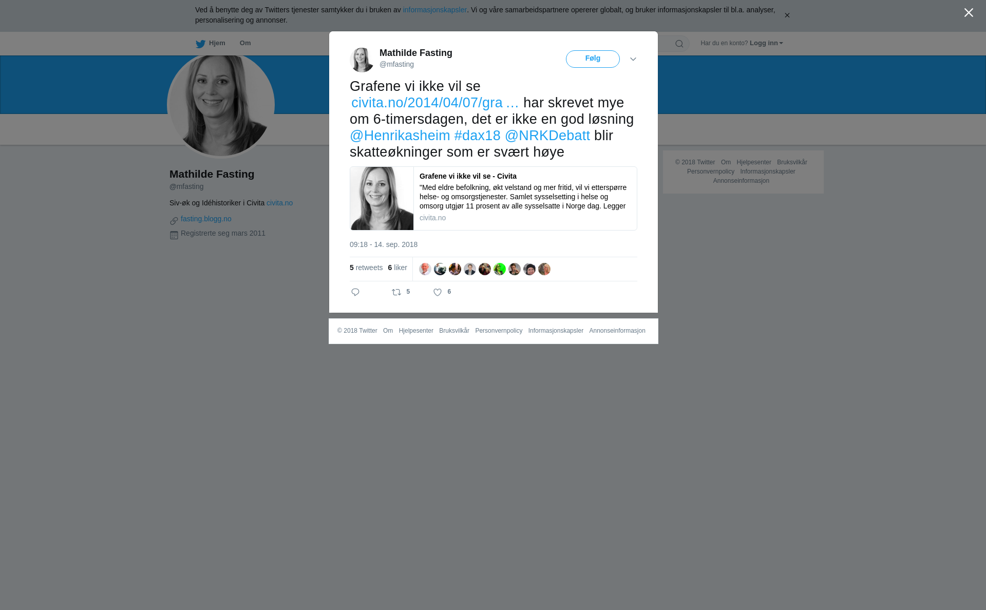 "Med eldre befolkning, økt velstand og mer fritid, vil vi etterspørre helse- og omsorgstjenester. Samlet sysselsetting i helse og omsorg utgjør 11 prosent av alle sysselsatte i Norge dag. Legger vi inn, som SSB har gjort, noen rimelige forutsetninger om hva som vil skje fremover, med én prosent vekst i helse- og omsorgsstandarden, vil 38 prosent av alle sysselsatte måtte jobbe i denne sektoren i fremtiden," skriver Mathilde Fasting.