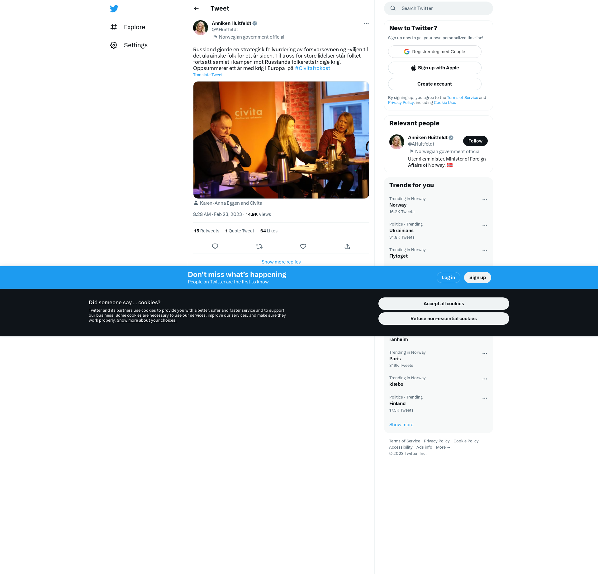 Russland gjorde en strategisk feilvurdering av forsvarsevnen og -viljen til det ukrainske folk for ett år siden. Til tross for store lidelser står folket fortsatt samlet i kampen mot Russlands folkerettstridige krig. Oppsummerer ett år med krig i Europa på #Civitafrokost https://t.co/f9HInPpDtj