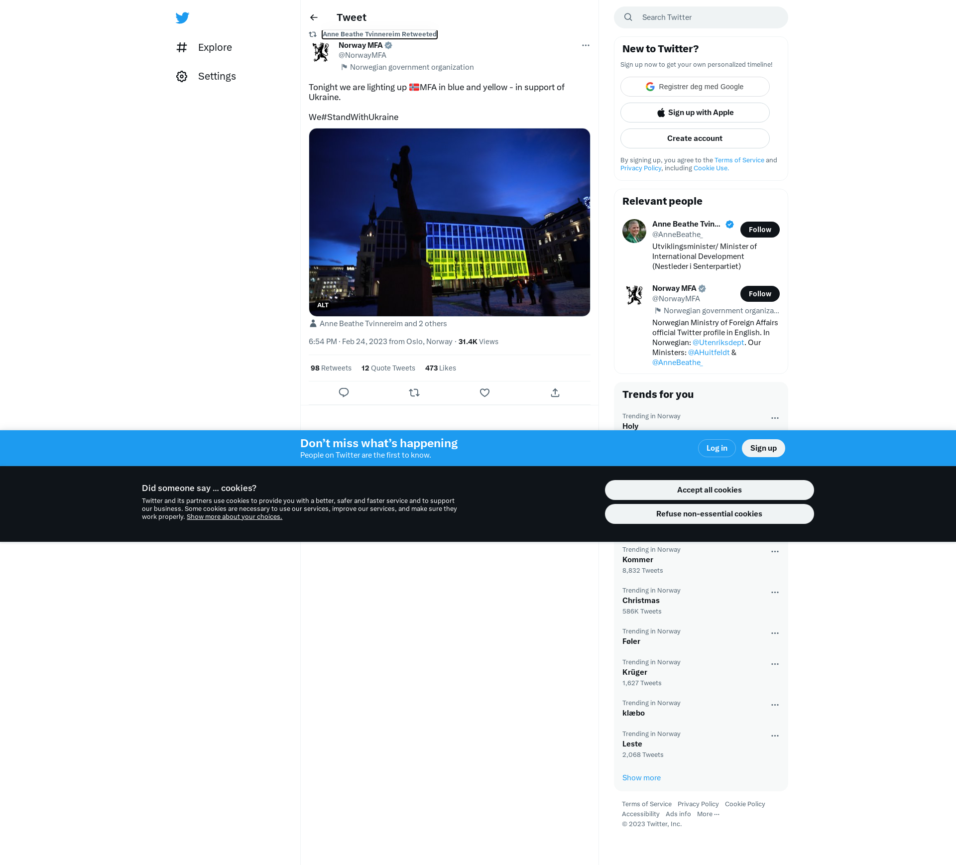 RT @NorwayMFA: Tonight we are lighting up 🇳🇴MFA in blue and yellow - in support of Ukraine. \n\nWe#StandWithUkraine https://t.co/iQCnqJ1iGc