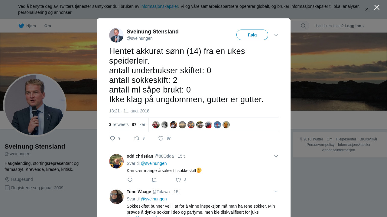 Hentet akkurat sønn (14) fra en ukes speiderleir. antall underbukser skiftet: 0 antall sokkeskift: 2 antall ml såpe brukt: 0 Ikke klag på ungdommen, gutter er gutter.