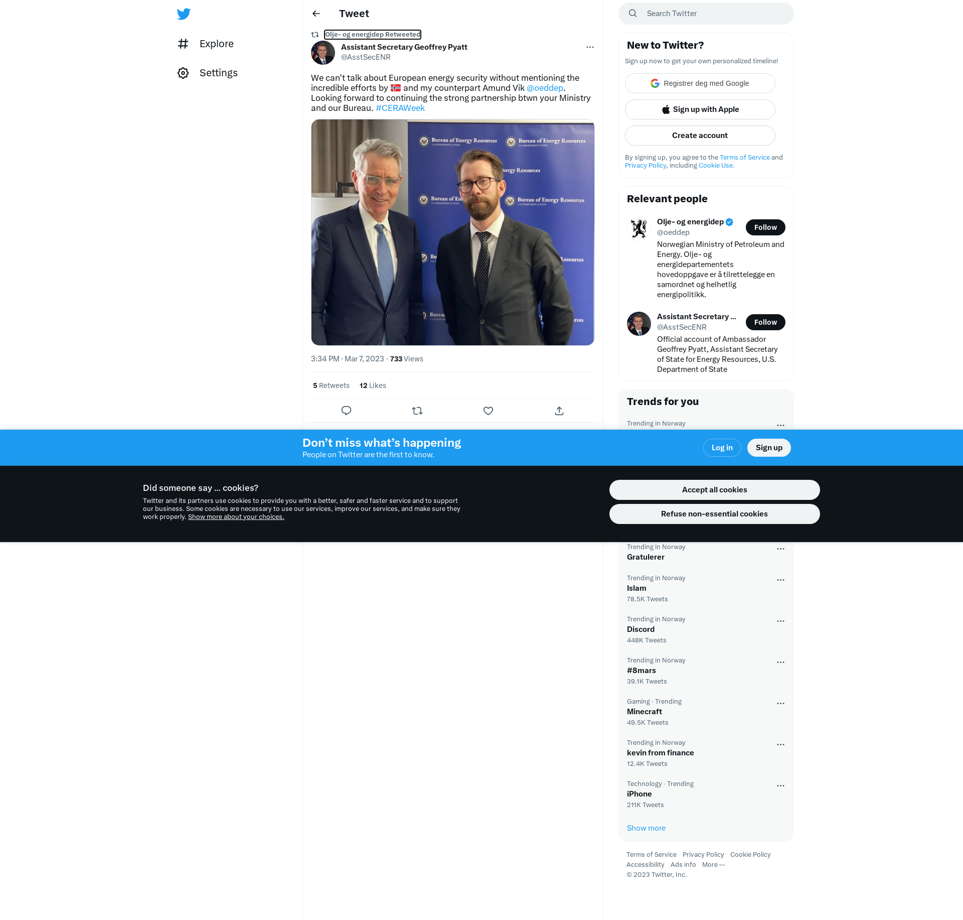 RT @AsstSecENR: We can’t talk about European energy security without mentioning the incredible efforts by 🇳🇴 and my counterpart Amund Vik @oeddep. Looking forward to continuing the strong partnership btwn your Ministry and our Bureau. #CERAWeek https://t.co/Yg6UNVWaVA