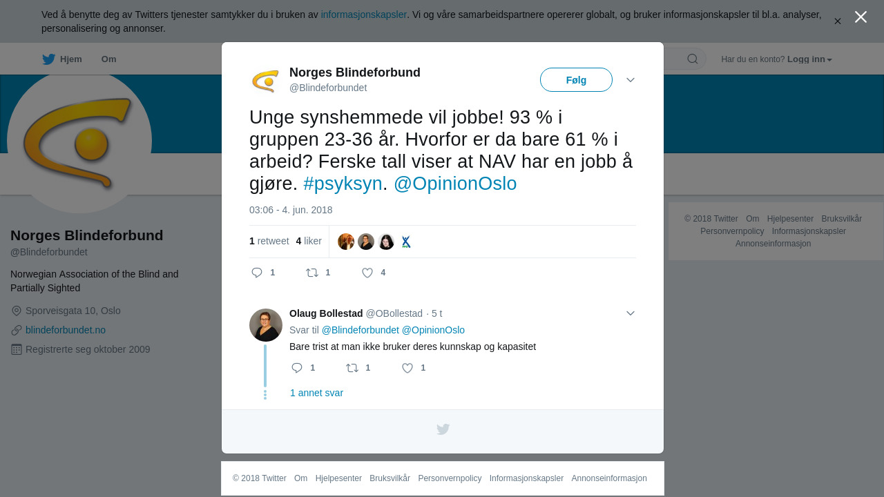 RT @Blindeforbundet: Unge synshemmede vil jobbe! 93 % i gruppen 23-36 år. Hvorfor er da bare 61 % i arbeid? Ferske tall viser at NAV har… https://t.co/xZIlt5jNBG
