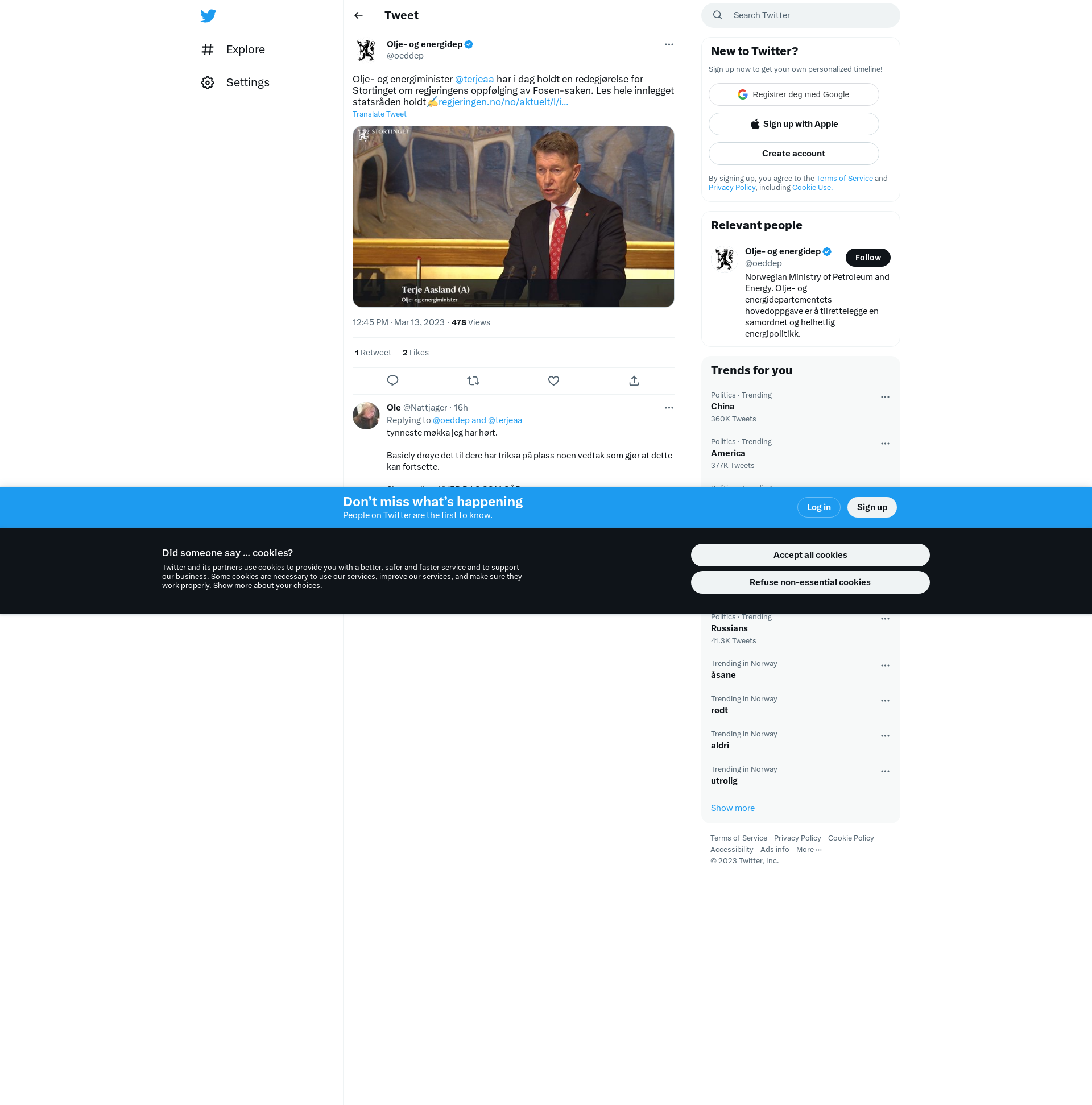 Olje- og energiminister Terje Aasland holdt denne redegjørelsen for Stortinget om regjeringens oppfølging av Fosen-saken mandag 13. mars 2023.
