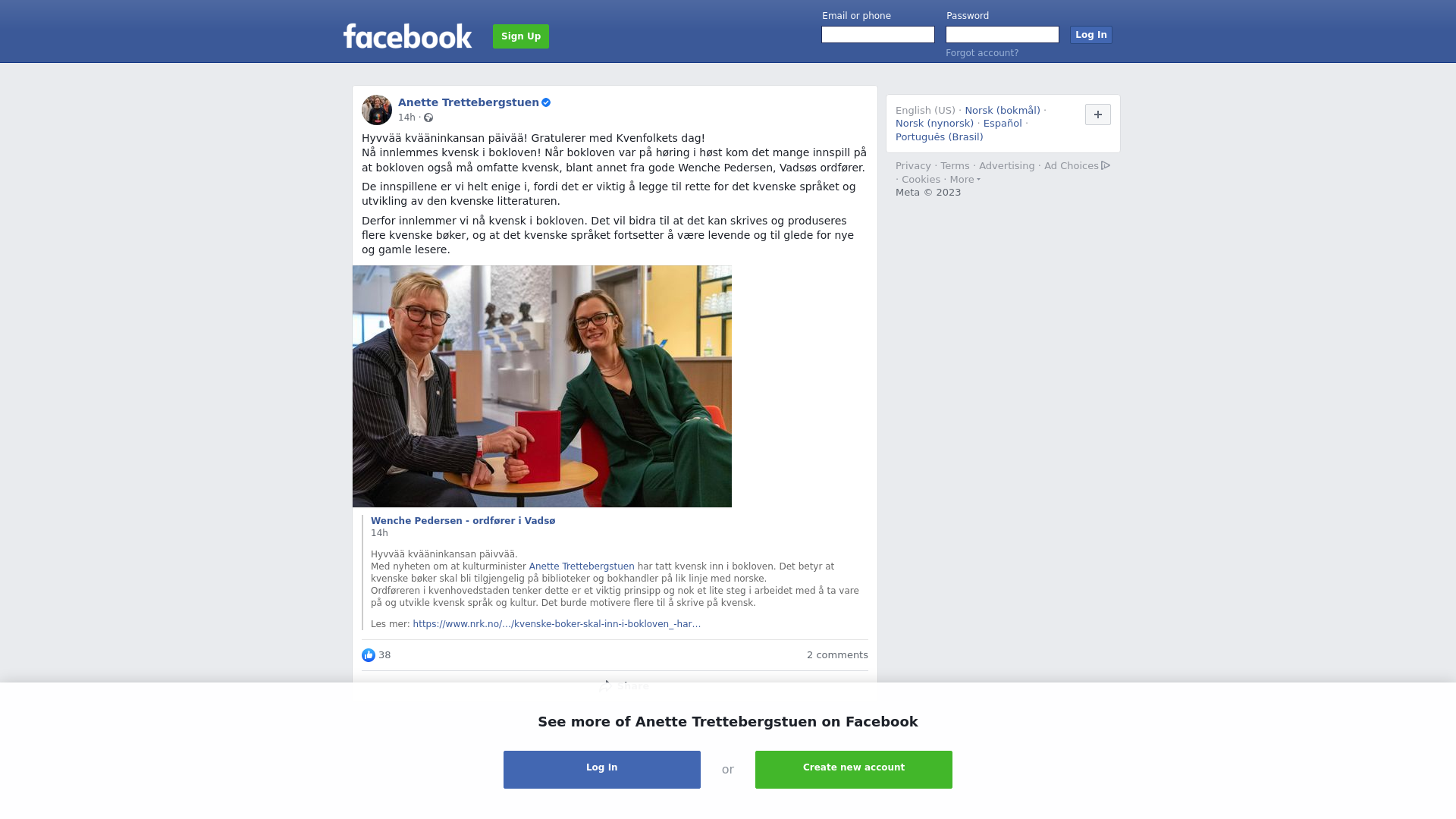 Hyvvää kvääninkansan päivvää. \nMed nyheten om at kulturminister Anette Trettebergstuen har tatt kvensk inn i bokloven. Det betyr at kvenske bøker skal bli tilgjengelig på biblioteker og bokhandler på lik linje med norske. \nOrdføreren i kvenhovedstaden tenker dette er et viktig prinsipp og nok et lite steg i arbeidet med å ta vare på og utvikle kvensk språk og kultur. Det burde motivere flere til å skrive på kvensk.\n\nLes mer: https://www.nrk.no/kvensk/kvenske-boker-skal-inn-i-bokloven_-har-regjeringen-bestemt-1.16337547