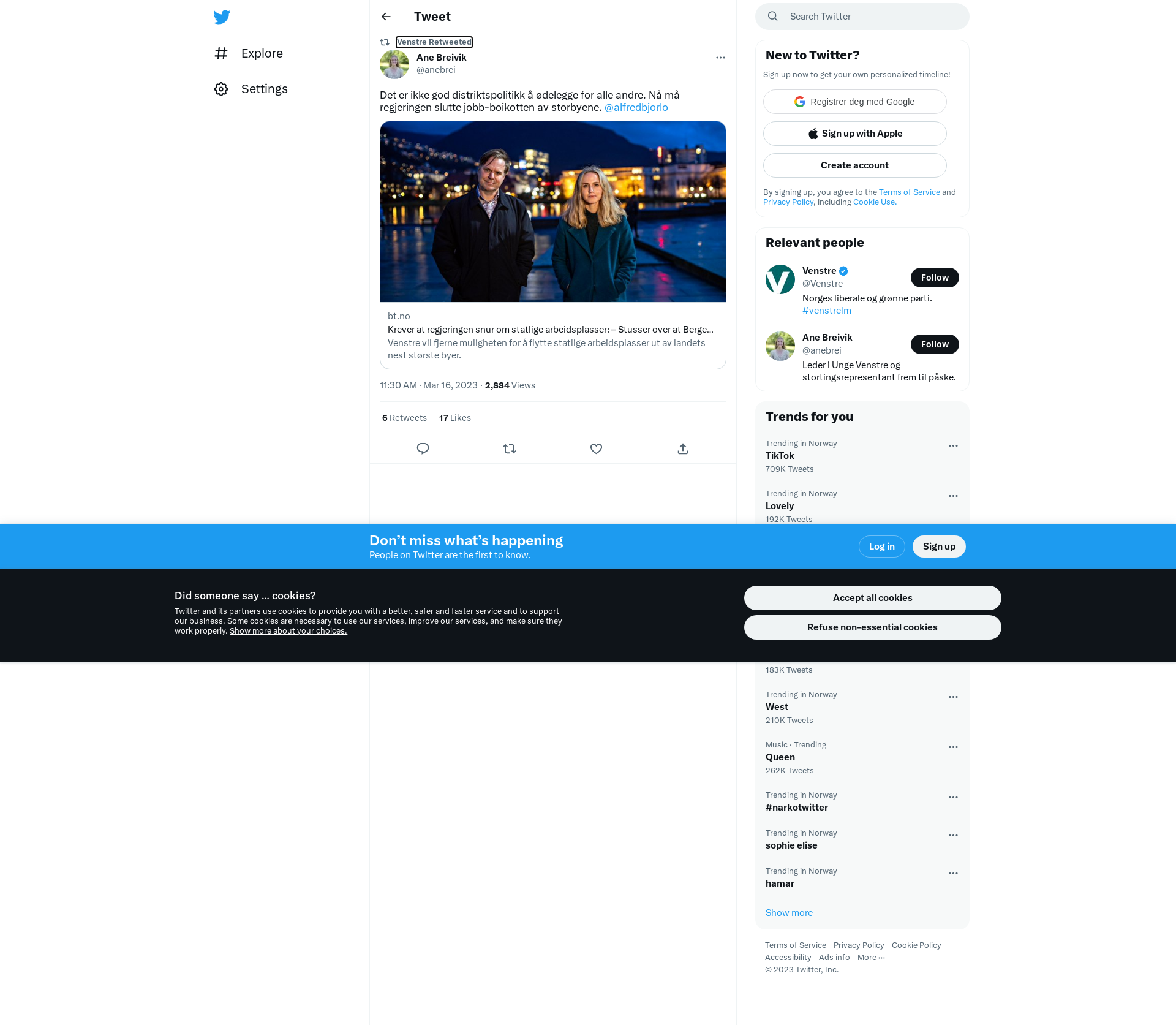 RT @anebrei: Det er ikke god distriktspolitikk å ødelegge for alle andre. Nå må regjeringen slutte jobb-boikotten av storbyene. @alfredbjorlo \nhttps://t.co/JCoR3WuAUW