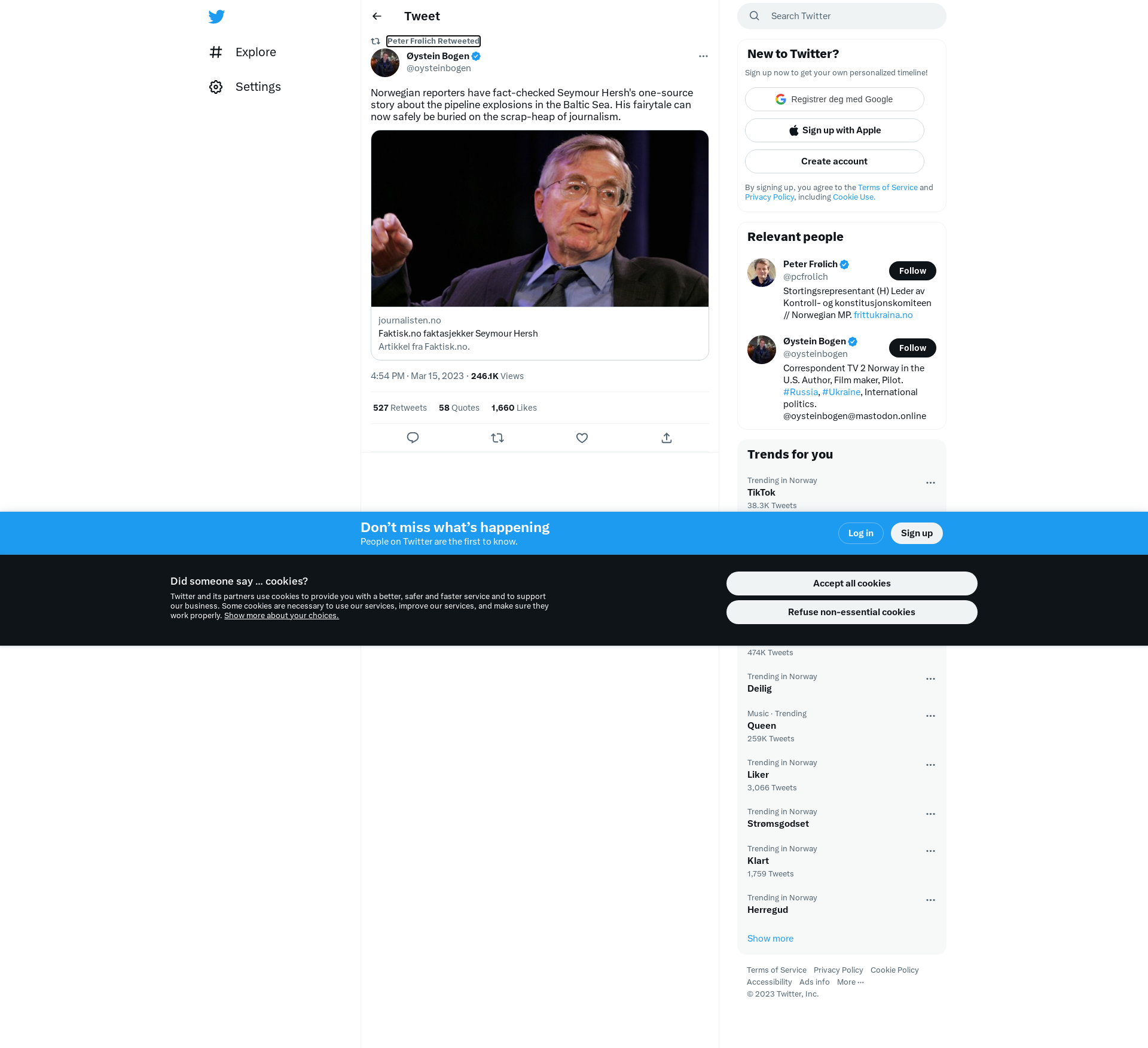 RT @oysteinbogen: Norwegian reporters have fact-checked Seymour Hersh's one-source story about the pipeline explosions in the Baltic Sea. His fairytale can now safely be buried on the scrap-heap of journalism. https://t.co/7QuapmI77F