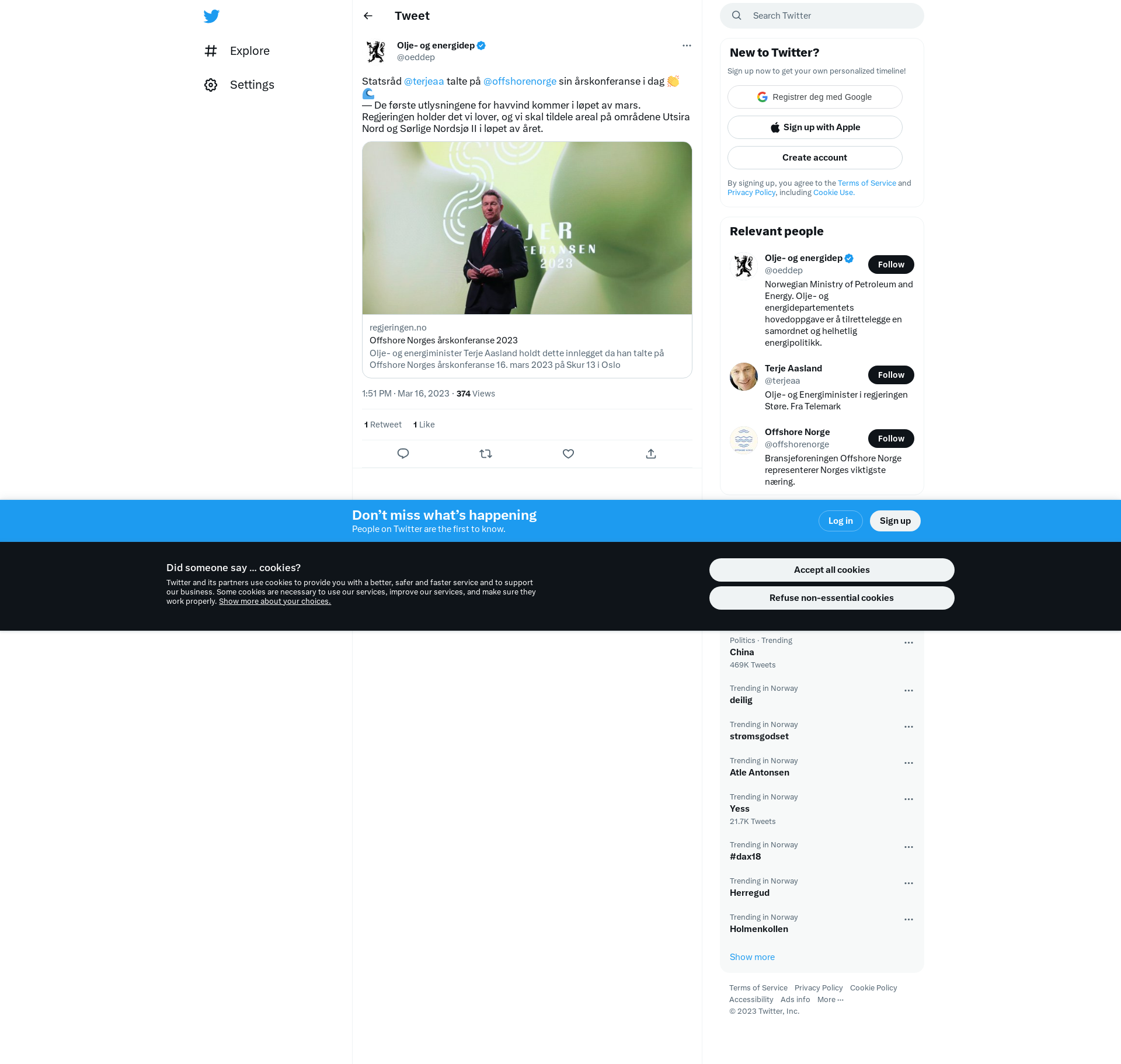 Statsråd @terjeaa talte på @offshorenorge sin årskonferanse i dag 👏🌊 \n— De første utlysningene for havvind kommer i løpet av mars. Regjeringen holder det vi lover, og vi skal tildele areal på områdene Utsira Nord og Sørlige Nordsjø II i løpet av året. https://t.co/jtPiDXk7fp
