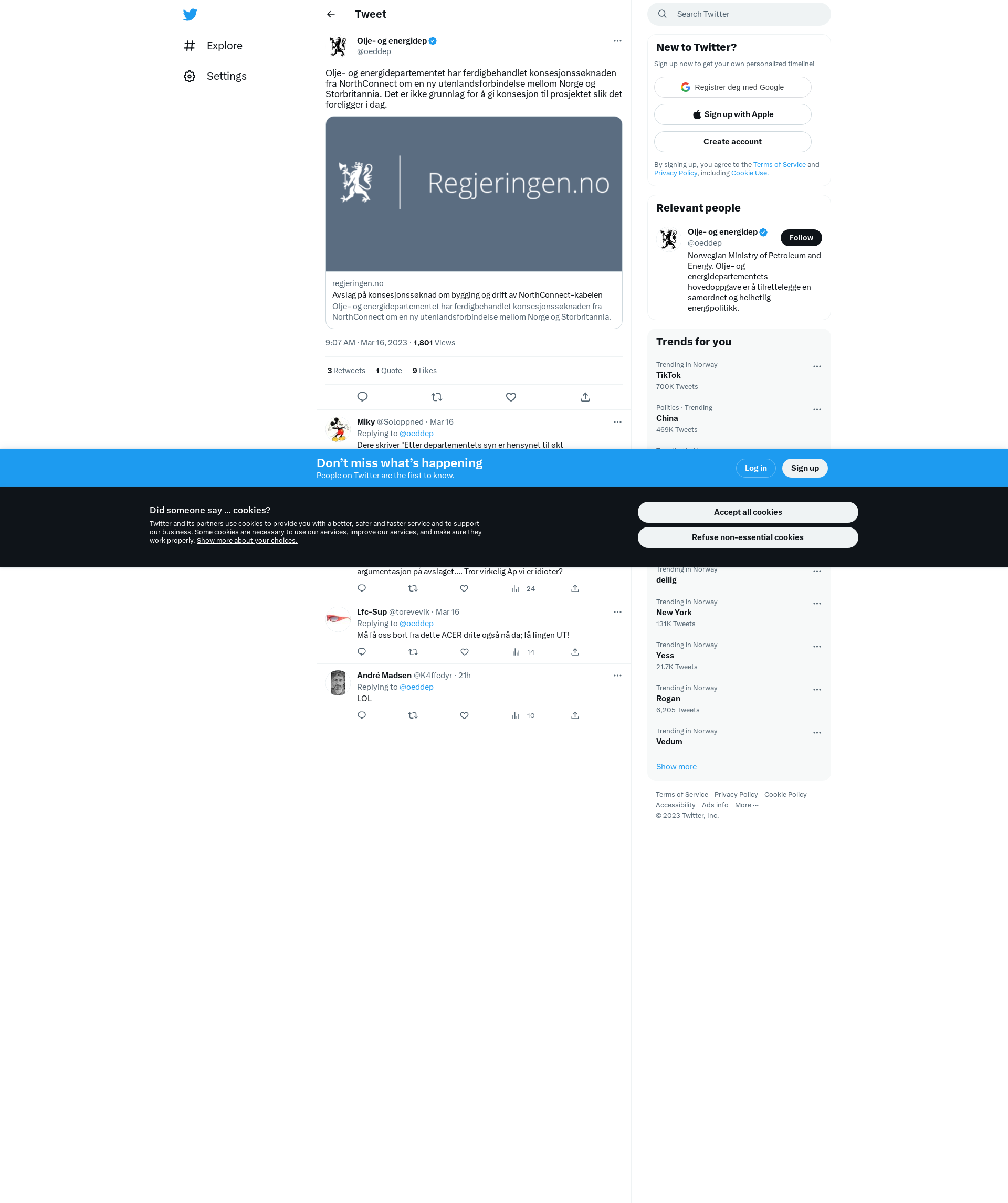 Olje- og energidepartementet har ferdigbehandlet konsesjonssøknaden fra NorthConnect om en ny utenlandsforbindelse mellom Norge og Storbritannia. Det er ikke grunnlag for å gi konsesjon til prosjektet slik det foreligger i dag. https://t.co/J0maRB7HuD