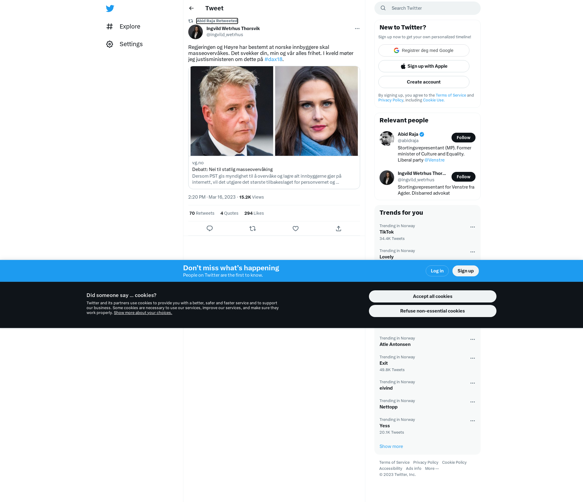 RT @ingvild_wetrhus: Regjeringen og Høyre har bestemt at norske innbyggere skal masseovervåkes. Det svekker din, min og vår alles frihet. I kveld møter jeg justisministeren om dette på #dax18. https://t.co/jk145EATRG