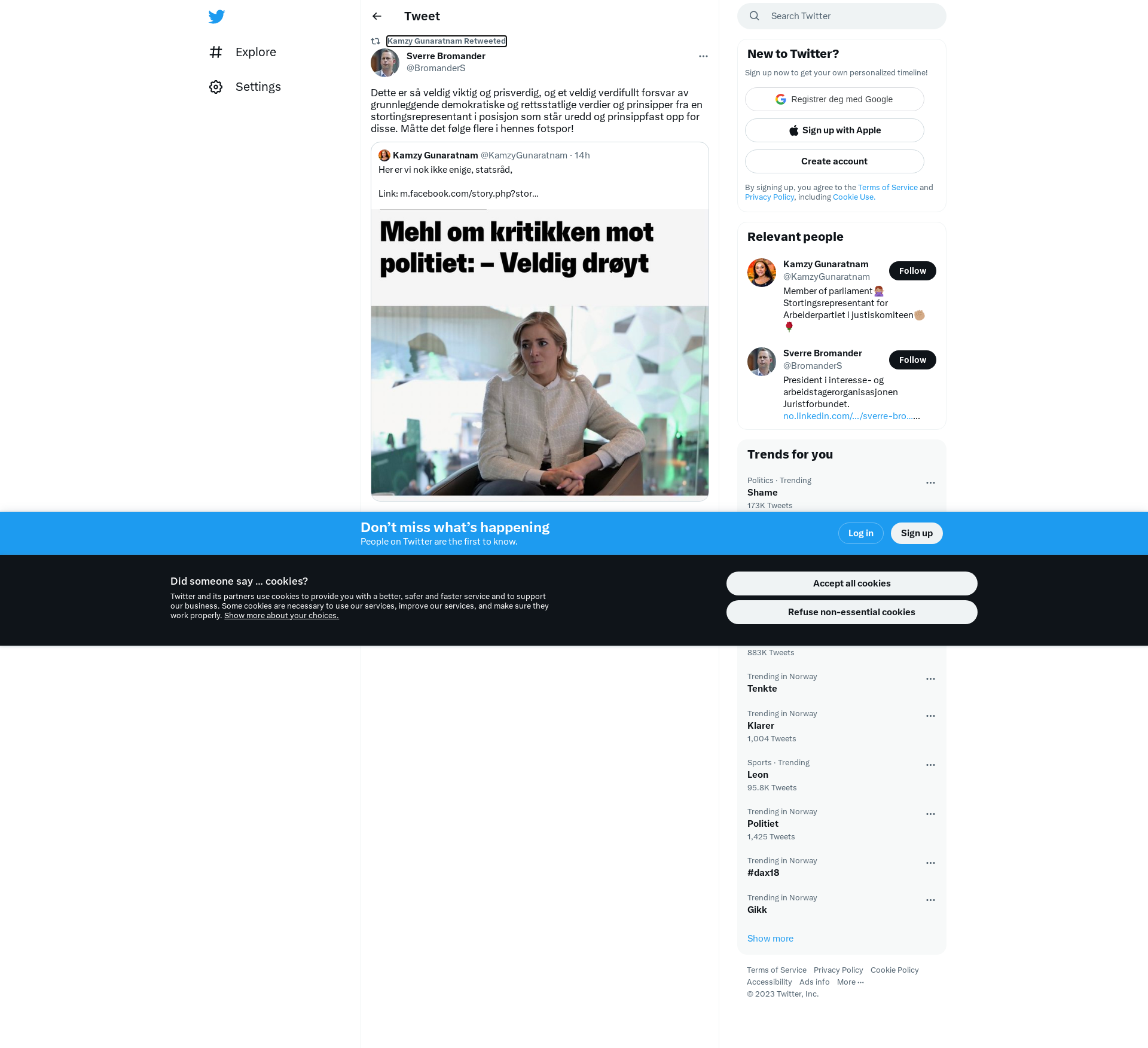 RT @BromanderS: Dette er så veldig viktig og prisverdig, og et veldig verdifullt forsvar av grunnleggende demokratiske og rettsstatlige verdier og prinsipper fra en stortingsrepresentant i posisjon som står uredd og prinsippfast opp for disse. Måtte det følge flere i hennes fotspor!