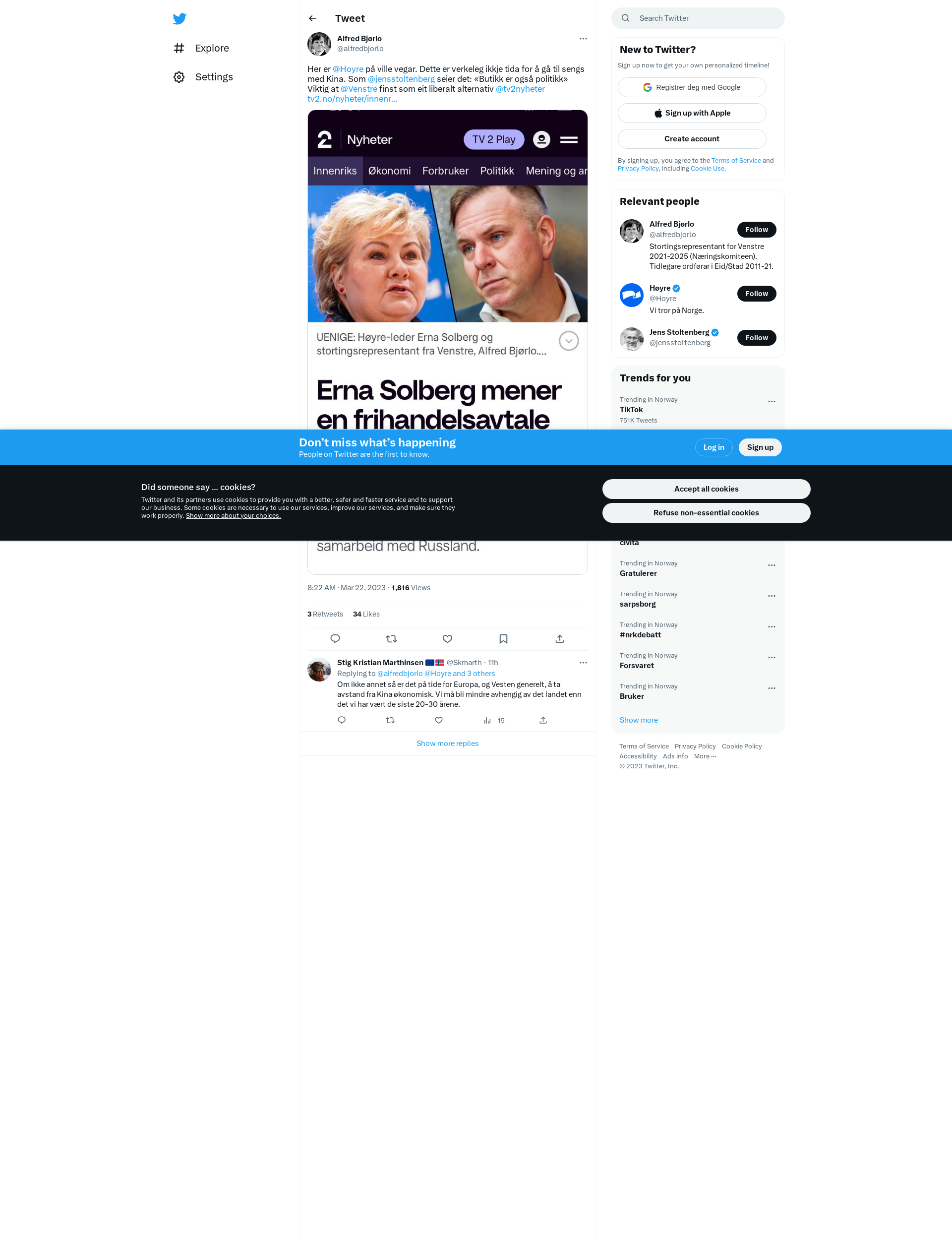 Her er @Hoyre på ville vegar. Dette er verkeleg ikkje tida for å gå til sengs med Kina. Som @jensstoltenberg seier det: «Butikk er også politikk» Viktig at @Venstre finst som eit liberalt alternativ @tv2nyheter https://t.co/xWxndjhmsT https://t.co/BICGMIVOzy