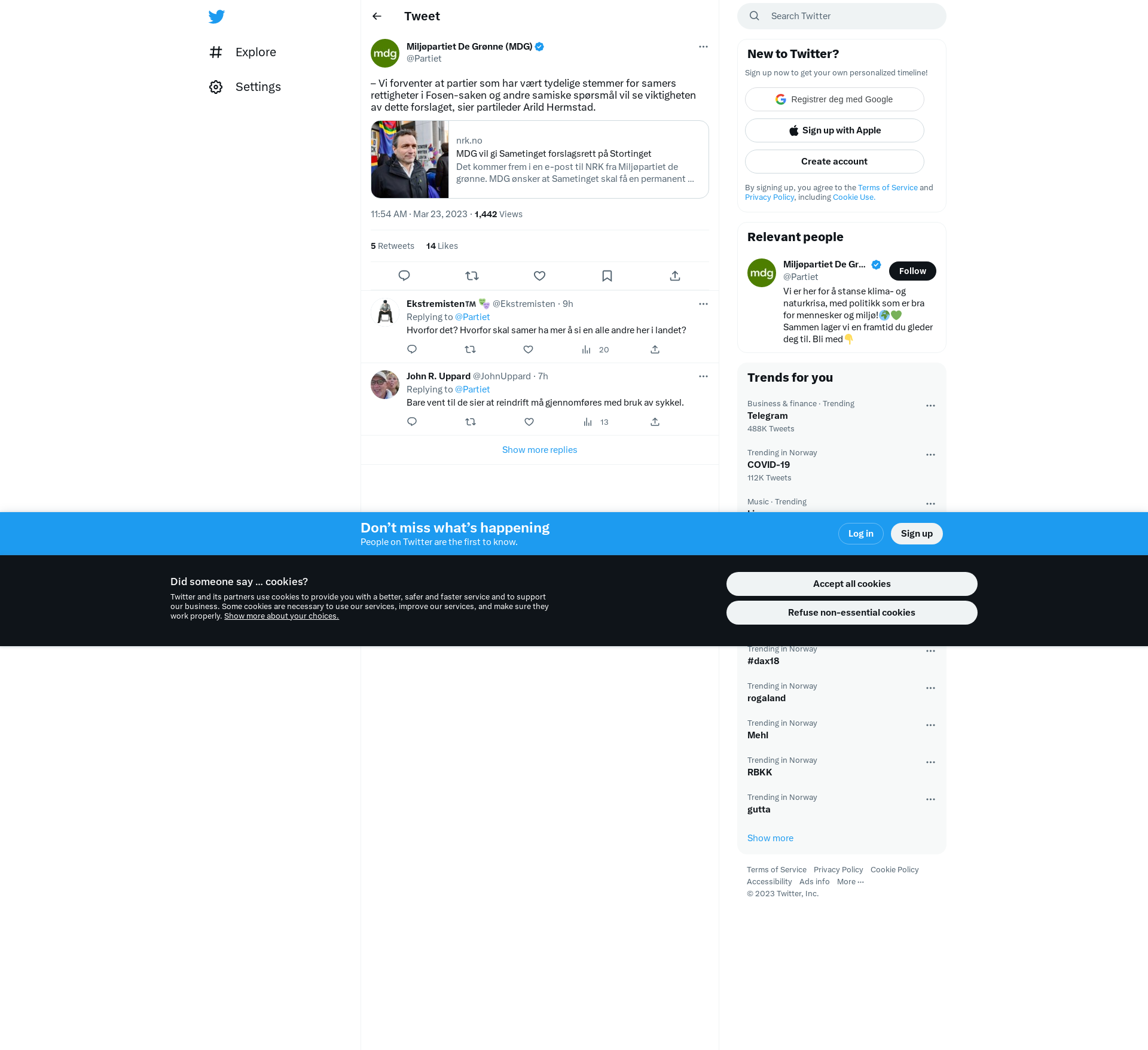 Det kommer frem i en e-post til NRK fra Miljøpartiet de grønne. MDG ønsker at Sametinget skal få en permanent forslagsrett på Stortinget, slik at samenes interesser i nasjonalforsamlingen styrkes. – Vi forventer i alle fall at partier som har vært tydelige stemmer for samers rettigheter i Fosen-saken og andre samiske spørsmål vil se viktigheten av dette forslaget, sier partileder Arild Hermstad. MDG mener det å gi Sametinget forslagsrett på Stortinget er helt naturlig, fordi det er det eneste parlamentet i Norge utenom Stortinget selv. – Etter årtier med at samer og andre urfolks rettigheter har blitt tilsidesatt, vil dette være et stort steg i retning for å skape tillit til staten for urfolk i Norge som har blitt sviktet og overkjørt ved en rekke anledninger, skriver MDG. MDG vil i første omgang stille et skriftlig spørsmål for å utfordre regjeringen på dette den kommende tiden. Hvis regjeringen ikke er enige i at Sametinget fortjener forslagsrett, må vi se på mulighetene rundt å frem