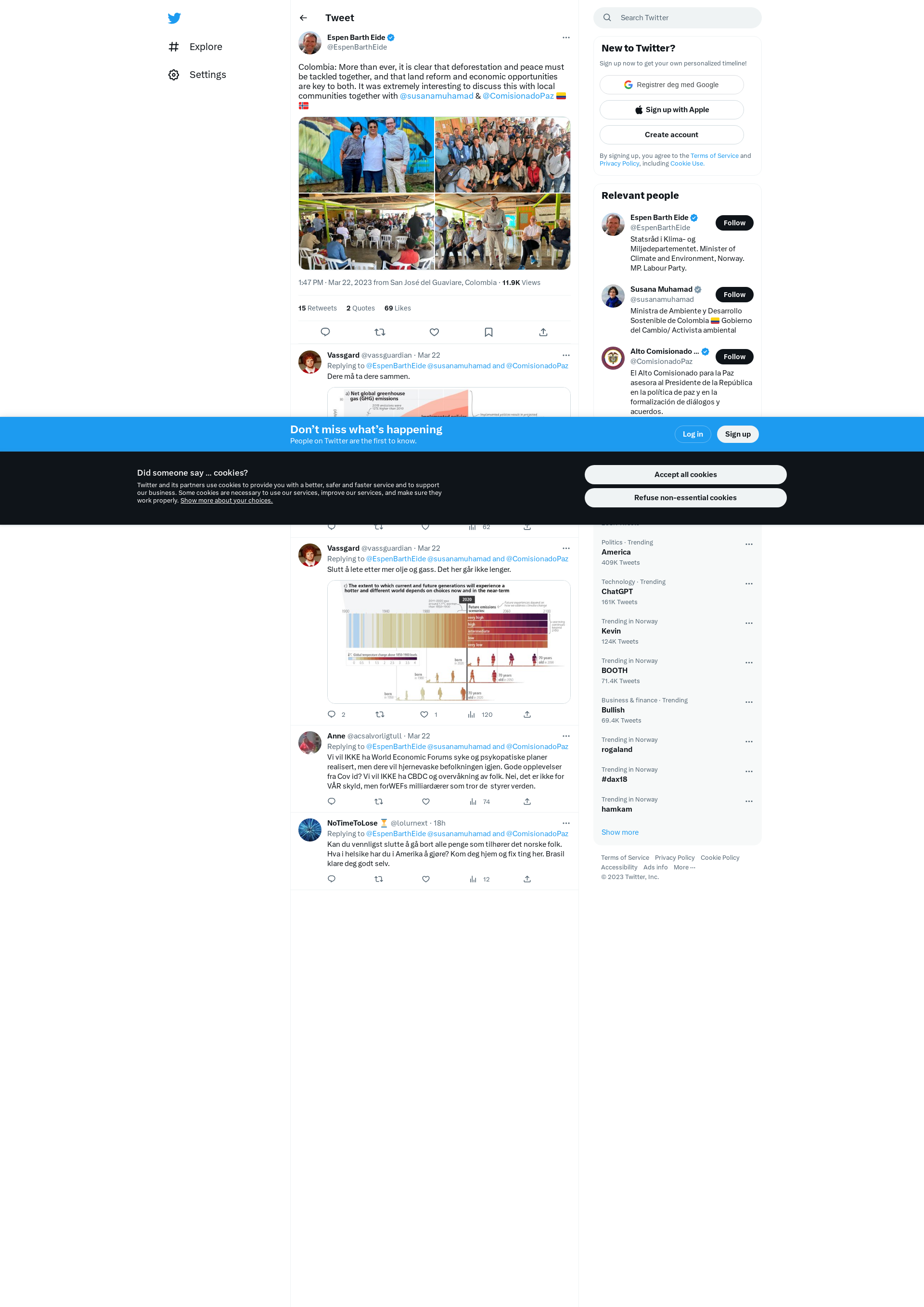 Colombia: More than ever, it is clear that deforestation and peace must be tackled together, and that land reform and economic opportunities are key to both. It was extremely interesting to discuss this with local communities together with @susanamuhamad & @ComisionadoPaz 🇨🇴🇳🇴 https://t.co/Lu4IYZYHyI
