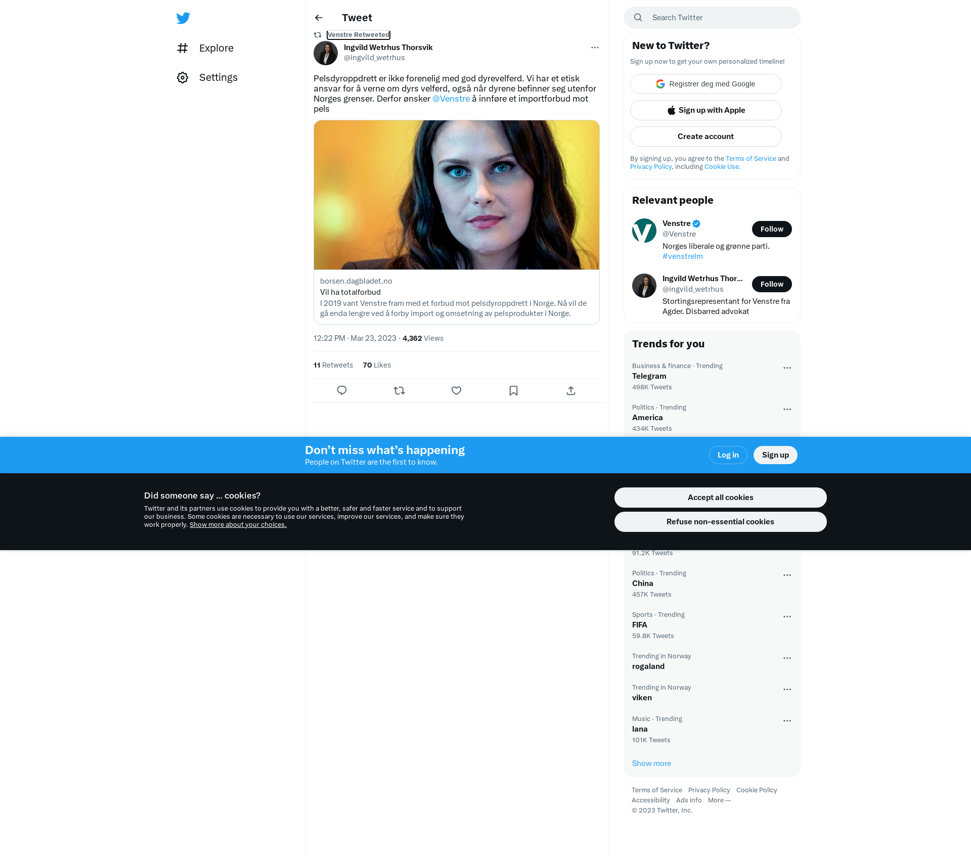 RT @ingvild_wetrhus: Pelsdyroppdrett er ikke forenelig med god dyrevelferd. Vi har et etisk ansvar for å verne om dyrs velferd, også når dyrene befinner seg utenfor Norges grenser. Derfor ønsker @Venstre å innføre et importforbud mot pels https://t.co/ZrLrp7NMgz