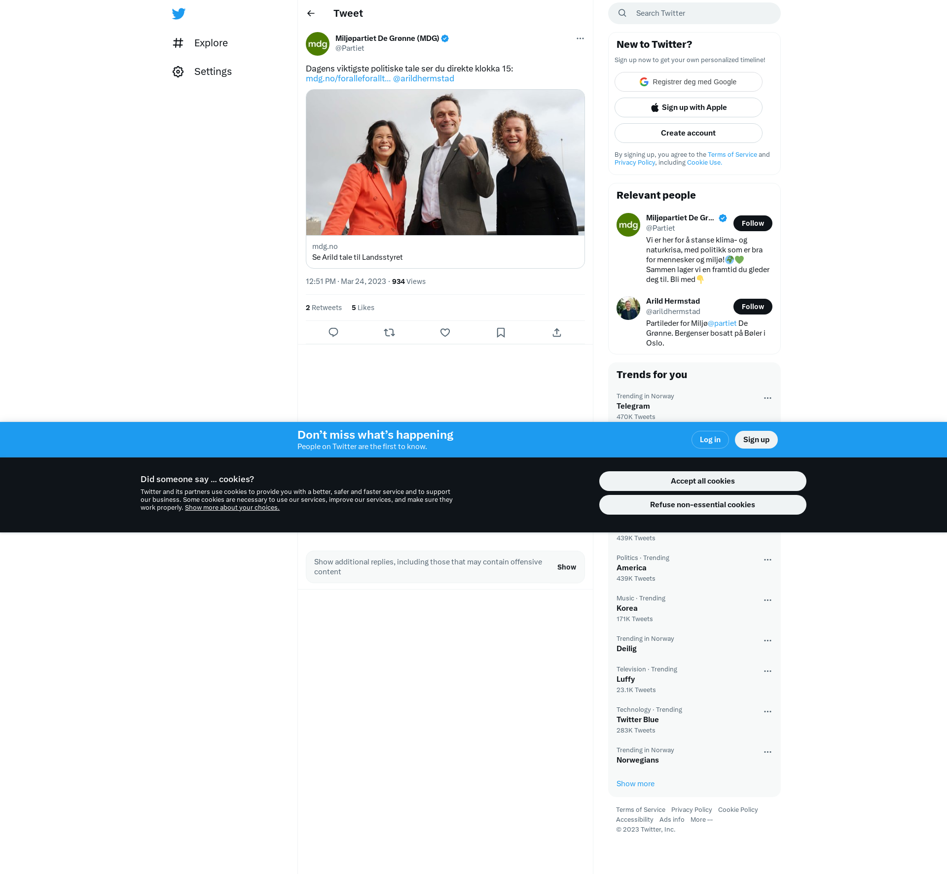 Fredag kl. 15 taler Arild Hermstad til Landsstyret i MDG. Se det direkte her! Du kan sette på varsel i Youtube, så får du beskjed når sendingen starter! Mer grønn politikk er mulig med din støtte. Pengene gjør at våre kandidater i lokalvalget kan nå flere velgere! Vi bruker informasjonskapsler (cookies) Vi bruker informasjonskapsler for å gi deg en best mulig brukeropplevelse, analysere trafikken på nettsiden og tilpasse innhold og annonser. Du kan lese mer og endre dine preferanser når som helst på
