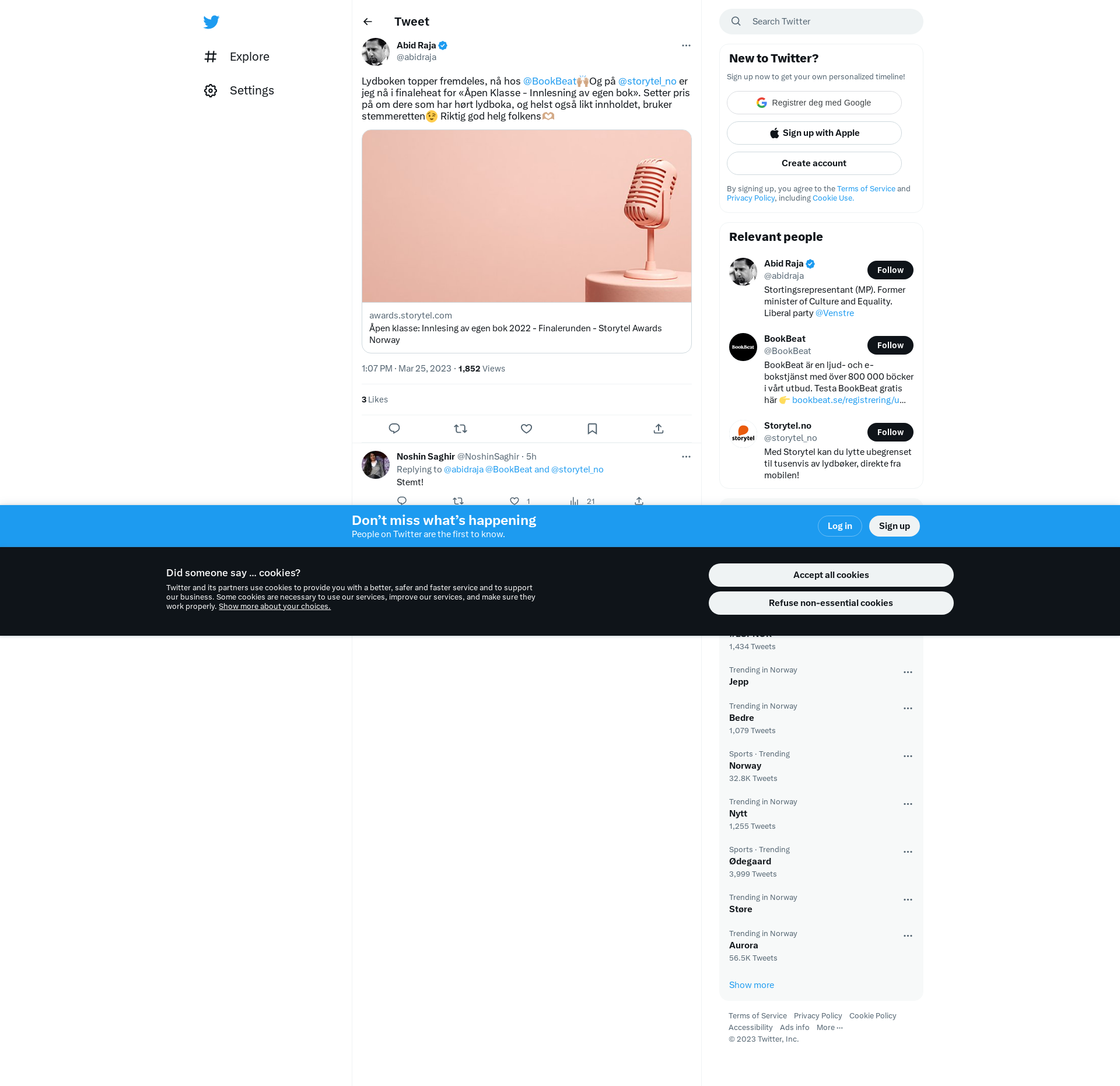 Lydboken topper fremdeles, nå hos @BookBeat🙌🏽Og på @storytel_no er jeg nå i finaleheat for «Åpen Klasse - Innlesning av egen bok». Setter pris på om dere som har hørt lydboka, og helst også likt innholdet, bruker stemmeretten😉 Riktig god helg folkens🫶🏽\nhttps://t.co/wzYNi4Gkn0