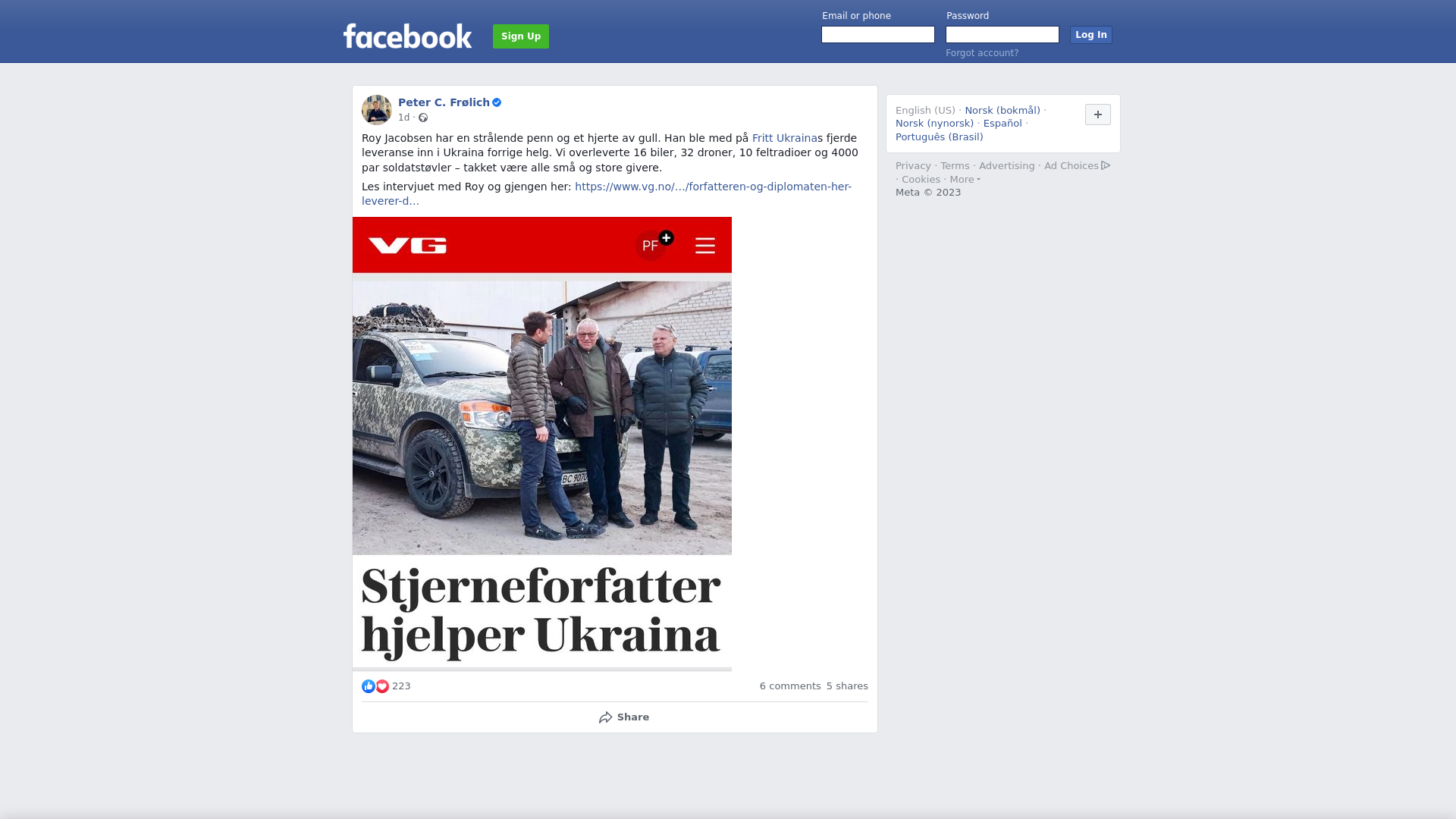 Roy Jacobsen har en strålende penn og et hjerte av gull. Han ble med på Fritt Ukrainas tredje leveranse inn i Ukraina forrige helg. Vi overleverte 16 biler, 32 droner, 10 feltradioer og 4000 par soldatstøvler – takket være alle små og store givere.\n\nLes intervjuet med Roy og gjengen her: https://www.vg.no/nyheter/utenriks/i/4oxmBG/forfatteren-og-diplomaten-her-leverer-de-droner-biler-og-radioer-til-den-ukrainske-fronten