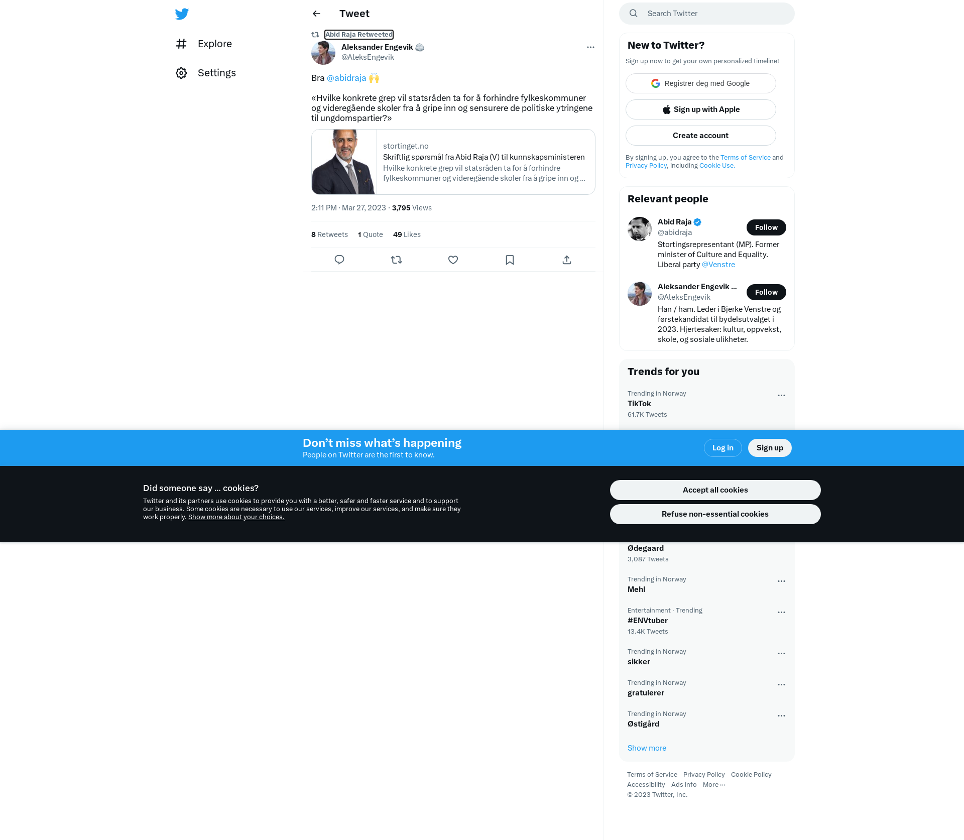 RT @AleksEngevik: Bra @abidraja 🙌\n\n«Hvilke konkrete grep vil statsråden ta for å forhindre fylkeskommuner og videregående skoler fra å grip…