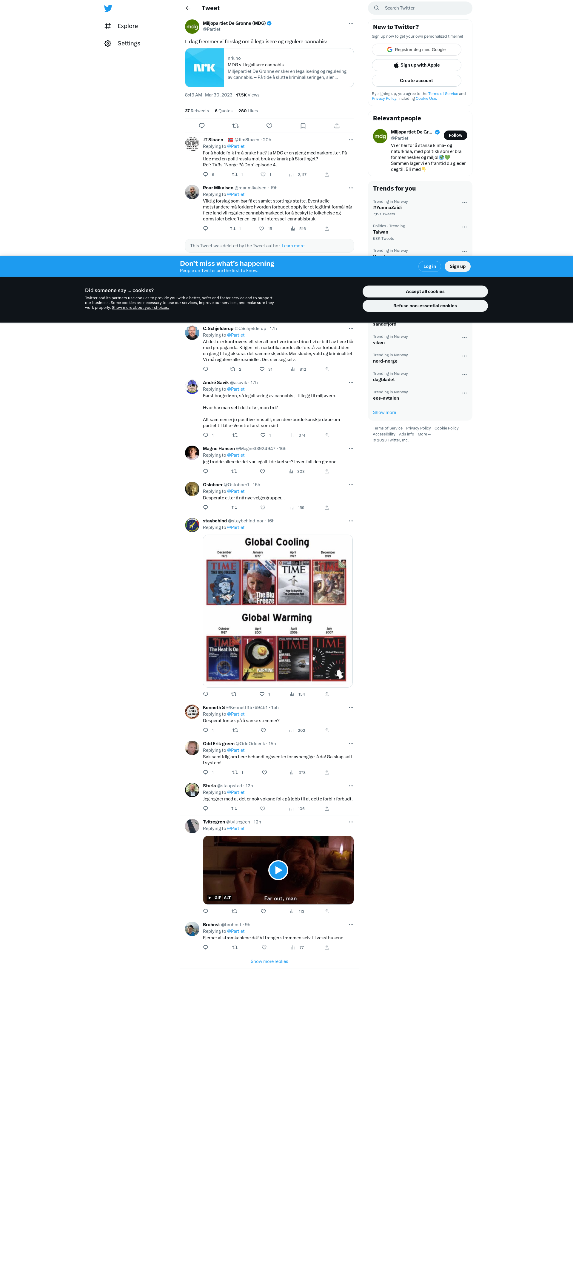 Miljøpartiet De Grønne ønsker en legalisering og regulering av cannabis. – På tide å slutte kriminaliseringen, sier talsperson Tobias Stokkeland i MDGs ungdomsparti Grønn Ungdom i en pressemelding. – I dag selges cannabis til hundretusener av nordmenn på det ulovlige markedet. Det betyr et marked uten aldersgrense eller stengetider, og brukere ikke vet styrken på cannabisen de får, eller om det har blitt tilsatt farligere stoffer, sier Stokkeland. Siden 2012 har seks land, samt 21 amerikanske stater legalisert og regulert cannabis til personlig bruk. – Det er på tide å slutte kriminaliseringen av en million nordmenn som har prøvd cannabis, sier Stokkeland. Forslaget legges offisielt fram torsdag av stortingsrepresentant Rasmus Hansson. Stortinget ber regjeringen blant annet utarbeide et lovforslag som legaliserer og regulerer salg av små mengder og besittelse av små mengder cannabis til eget bruk. (NTB)
