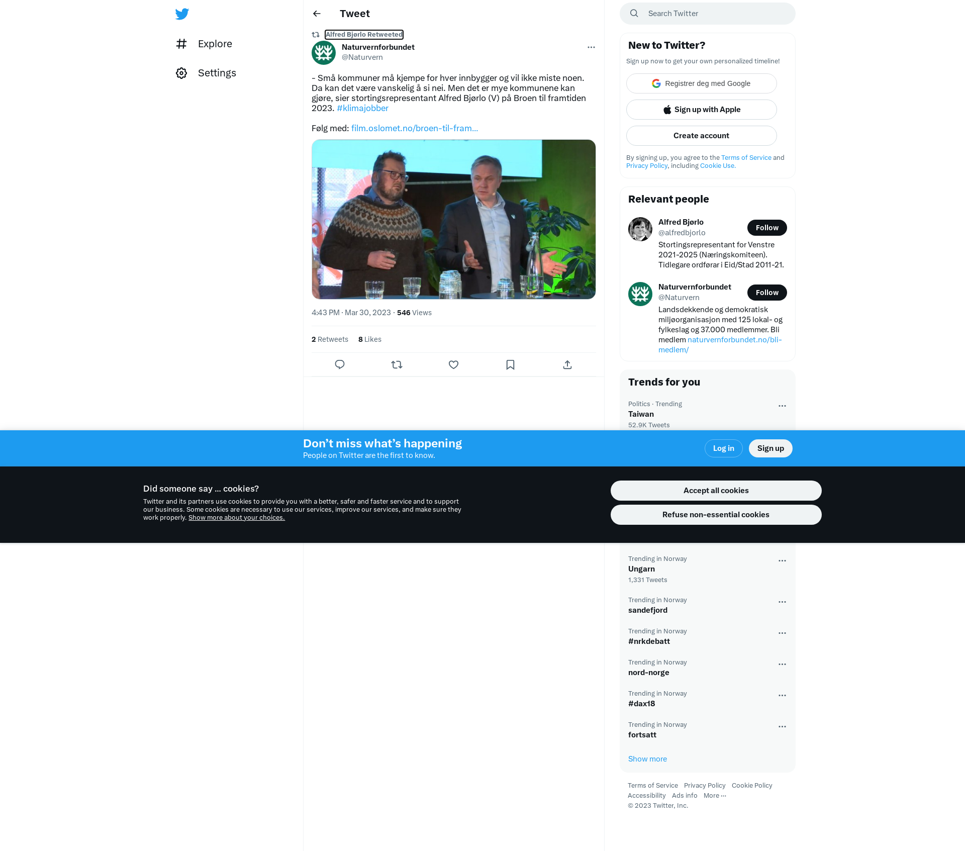 RT @Naturvern: - Små kommuner må kjempe for hver innbygger og vil ikke miste noen. Da kan det være vanskelig å si nei. Men det er mye kommunene kan gjøre, sier stortingsrepresentant Alfred Bjørlo (V) på Broen til framtiden 2023. #klimajobber\n\nFølg med: https://t.co/6LW3Uj2Qtx https://t.co/Q4nBoExlif