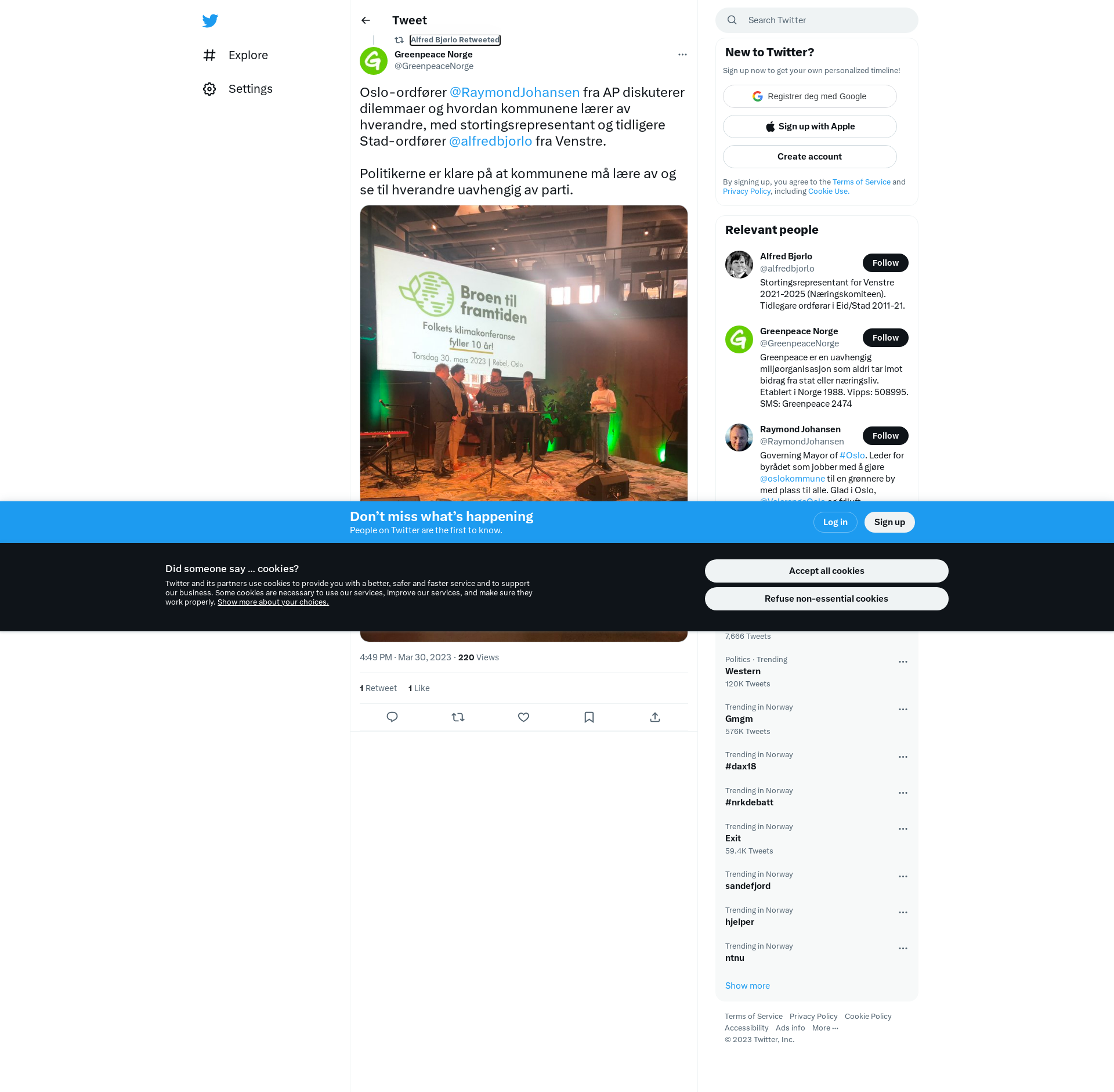 RT @GreenpeaceNorge: Oslo-ordfører @RaymondJohansen fra AP diskuterer dilemmaer og hvordan kommunene lærer av hverandre, med stortingsrepresentant og tidligere Stad-ordfører @alfredbjorlo fra Venstre.\n\nPolitikerne er klare på at kommunene må lære av og se til hverandre uavhengig av parti. https://t.co/cikbXjhIyq