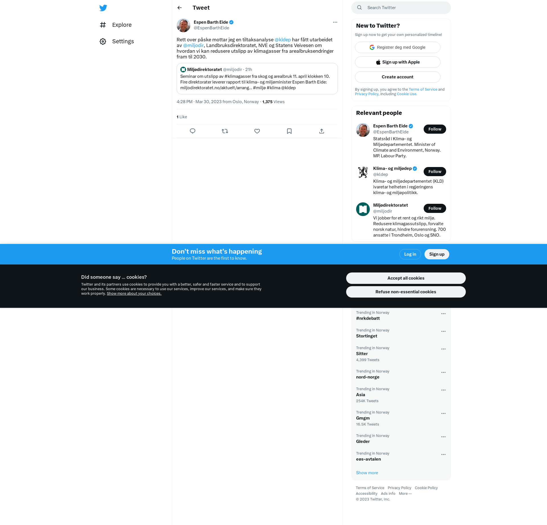 Rett over påske mottar jeg en tiltaksanalyse @kldep har fått utarbeidet av @miljodir, Landbruksdirektoratet, NVE og Statens Veivesen om hvordan vi kan redusere utslipp av klimagasser fra arealbruksendringer fram til 2030.