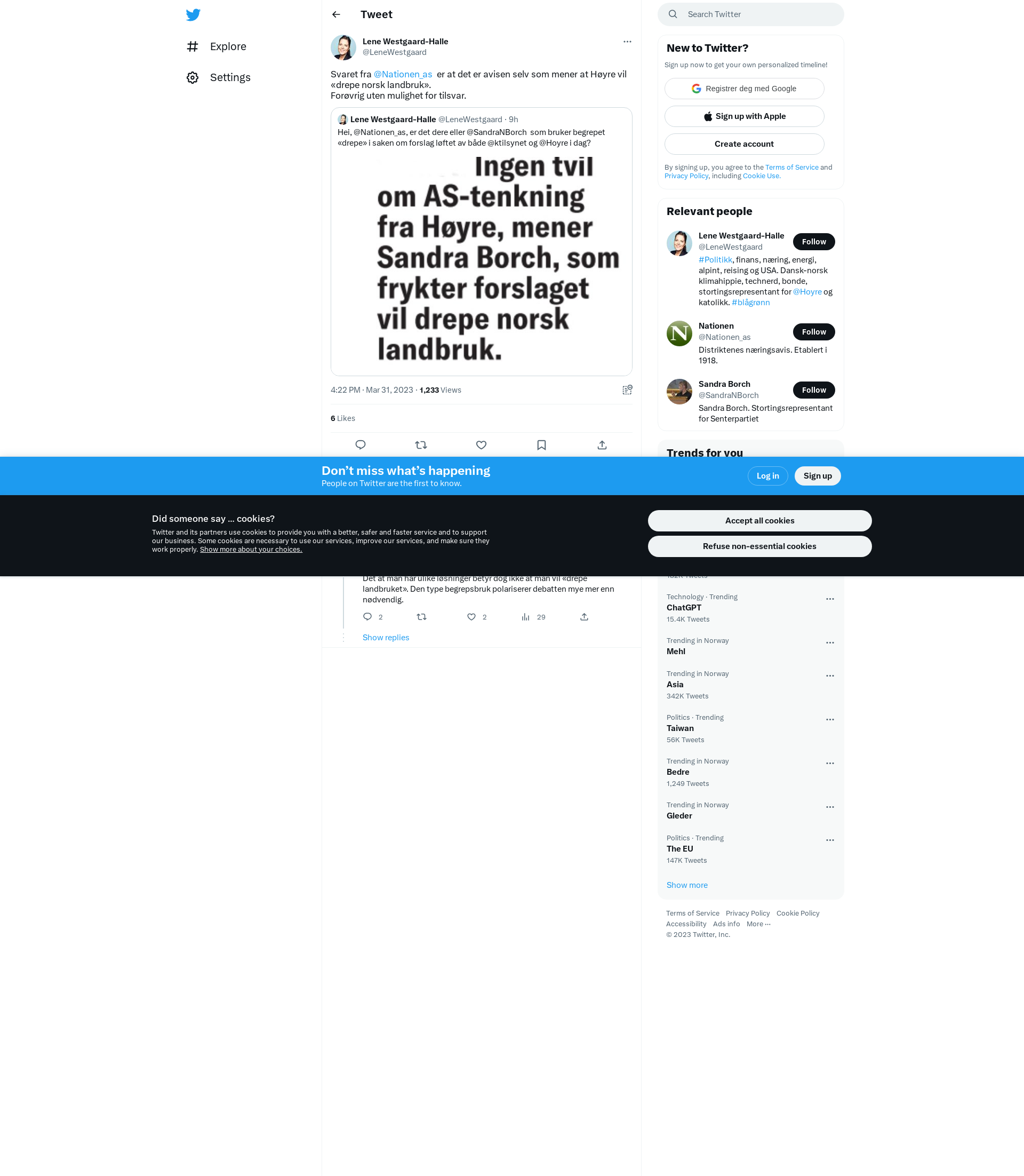 Svaret fra @Nationen_as er at det er avisen selv som mener at Høyre vil «drepe norsk landbruk». \nForøvrig uten mulighet for tilsvar.
