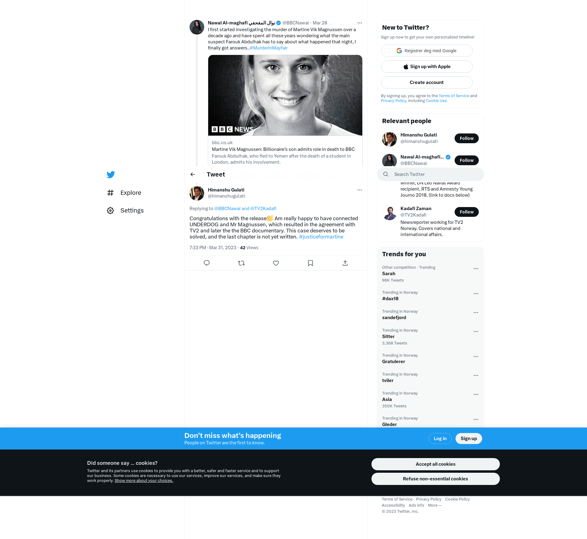 @BBCNawal @TV2Kadafi Congratulations with the release👏 Am really happy to have connected UNDERDOG and Mr Magnussen, which resulted in the agreement with TV2 and later the the BBC documentary. This case deserves to be solved, and the last chapter is not yet written. #justiceformartine