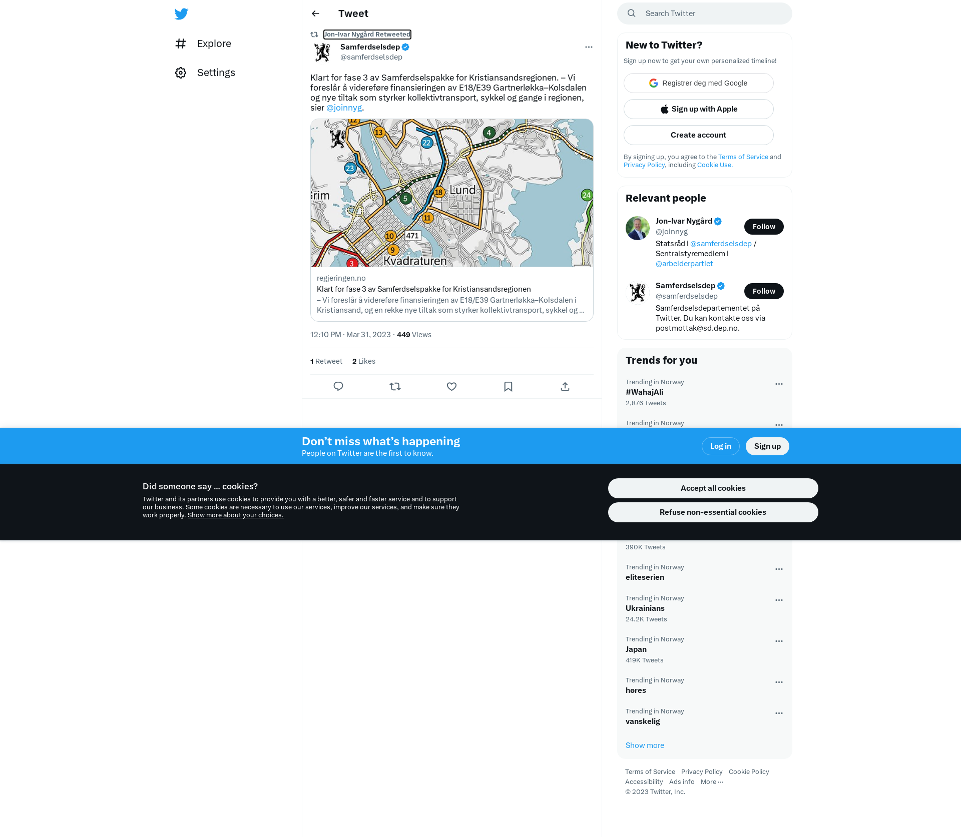 RT @samferdselsdep: Klart for fase 3 av Samferdselspakke for Kristiansandsregionen. – Vi foreslår å videreføre finansieringen av E18/E39 Gartnerløkka–Kolsdalen og nye tiltak som styrker kollektivtransport, sykkel og gange i regionen, sier @joinnyg.\nhttps://t.co/2bq0kAqJGG