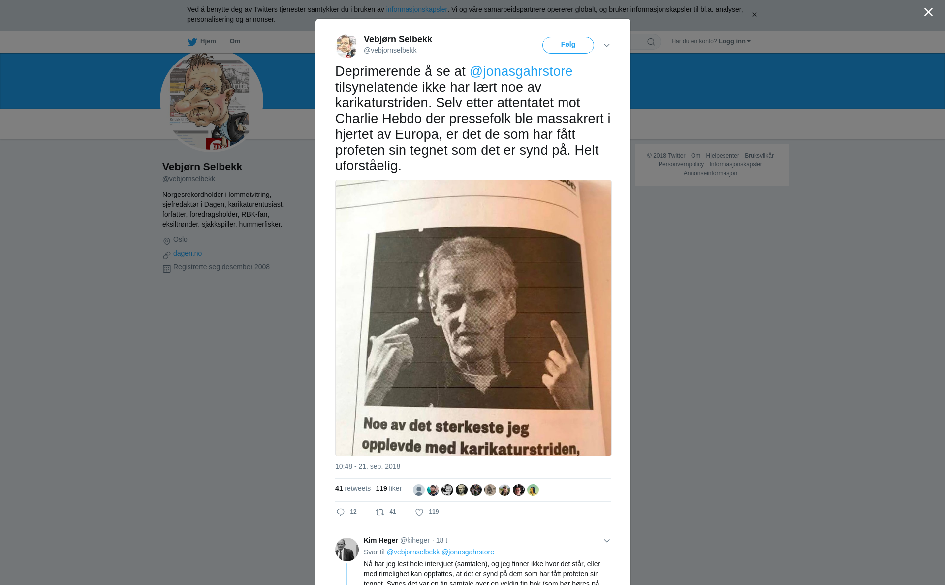 RT @vebjornselbekk: Deprimerende å se at @jonasgahrstore tilsynelatende ikke har lært noe av karikaturstriden. Selv etter attentatet mot Charlie Hebdo der pressefolk ble massakrert i hjertet av Europa, er det de som har fått profeten sin tegnet som det er synd på. Helt uforståelig. https://t.co/ZlAC6Mbca1