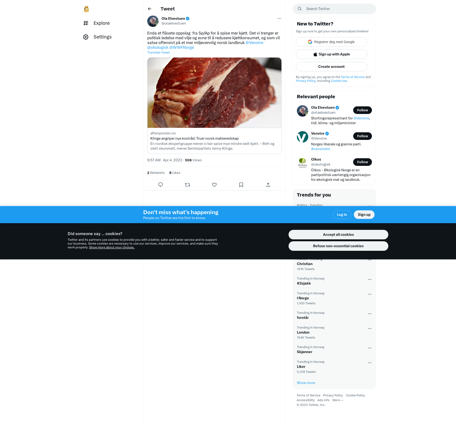 Enda et flåsete oppslag fra Sp/Ap for å spise mer kjøtt. Det vi trenger er politisk ledelse med vilje og evne til å redusere kjøttkonsumet, og som vil satse offensivt på et mer miljøvennlig norsk landbruk @Venstre @okologisk @WWFNorge https://t.co/hXomSVungI